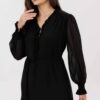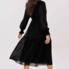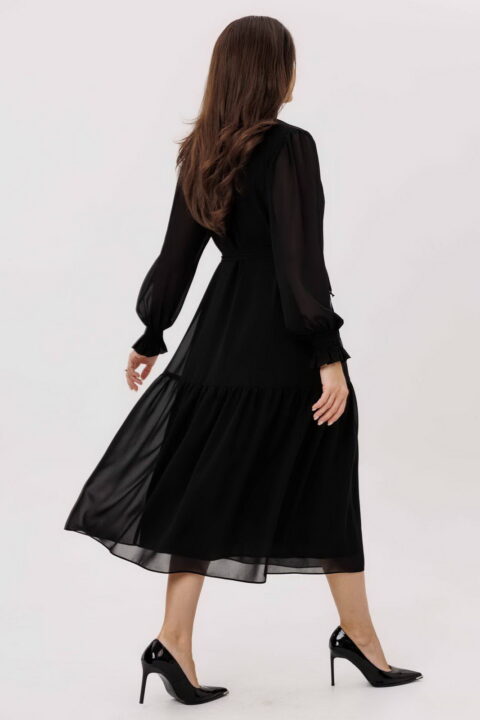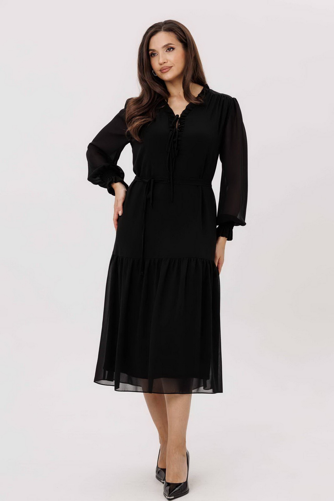 Описание: Платье свободного силуэта с подрезом ниже линии бедер. Перед с кокеткой. Горловина обработана рюшей и завязками. Рукав одношовный, заканчивающийся манжетой на венгерке. По окату рукава сборка. Платье на подкладке. Дополняет модель пояс.