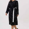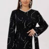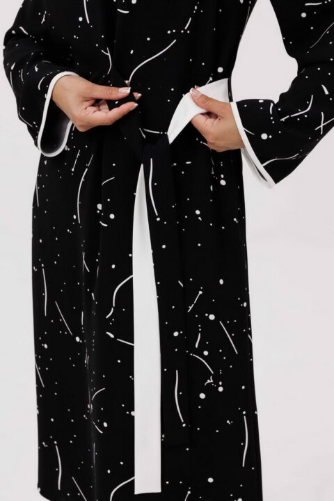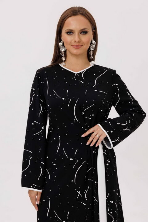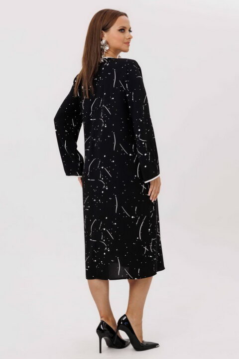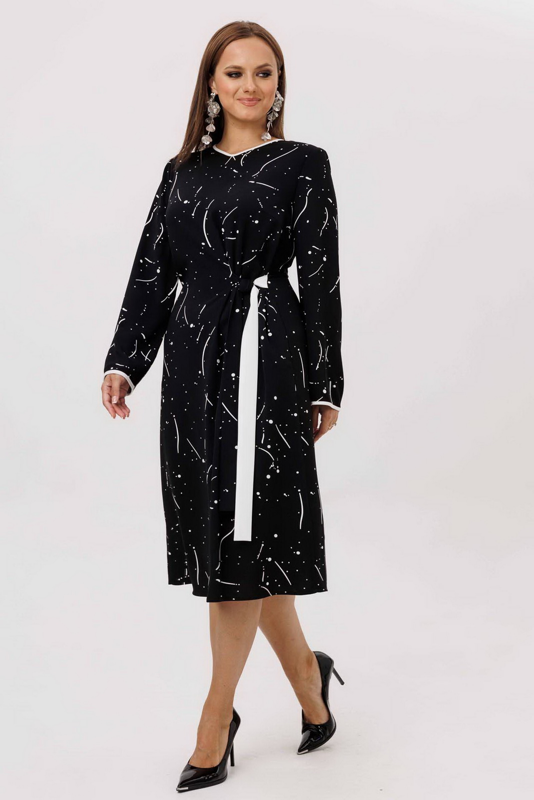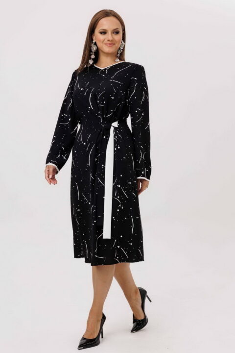 Описание: Платье свободного силуэта, перед с нагрудными вытачками. Рукава втачные, одношовные. Спинка со средним швом, с застежкой на тесьму-молнию. Горловина и низ рукава обработаны отделочной тканью. Изделие завязывается за счет контрастного полупояса.
