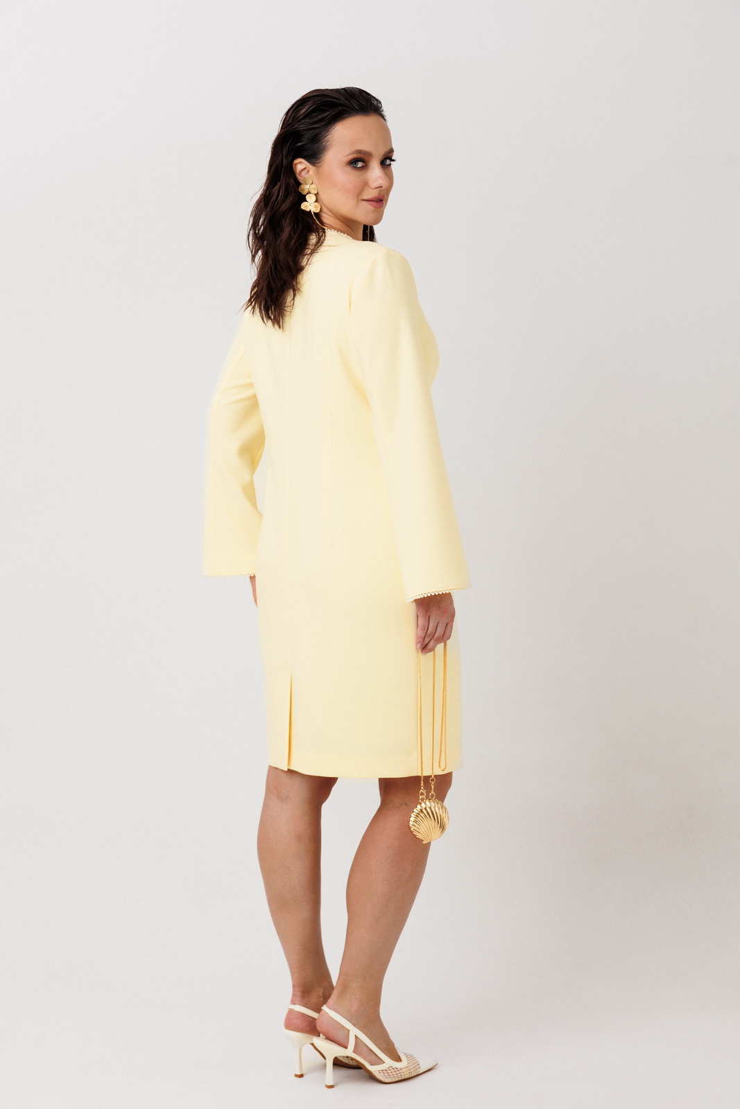 Конструктивные особенности: Прямой крой с приталенным силуэтом подчеркивает фигуру, сохраняя строгую линию. Спинка выполнена без декоративных элементов (простая конструкция, соответствующая стандартам швейного производства). Идеально для официальных мероприятий, деловых встреч и вечерних образов. Сочетает классические элементы костюмной моды с современными деталями, характерными для трендов 2026 года.