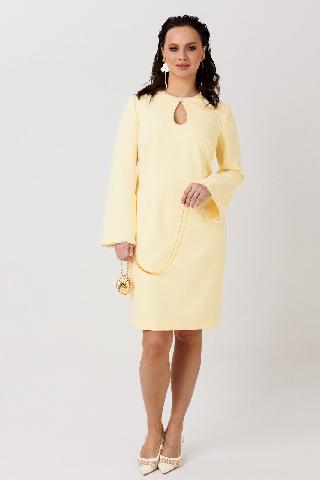 Описание: Элегантное платье-футляр, выполненное из плотной плательной ткани на подкладке. Дизайн акцентирован декоративной бейкой с жемчужным оформлением на горловине и манжетах рукавов — технически точная обработка краев, обеспечивающая долговечность и эстетику. Центральная деталь — пуговица-застежка на горловине, формирующая изысканный вырез-капель с эффектом глубины.