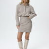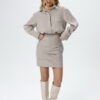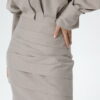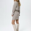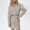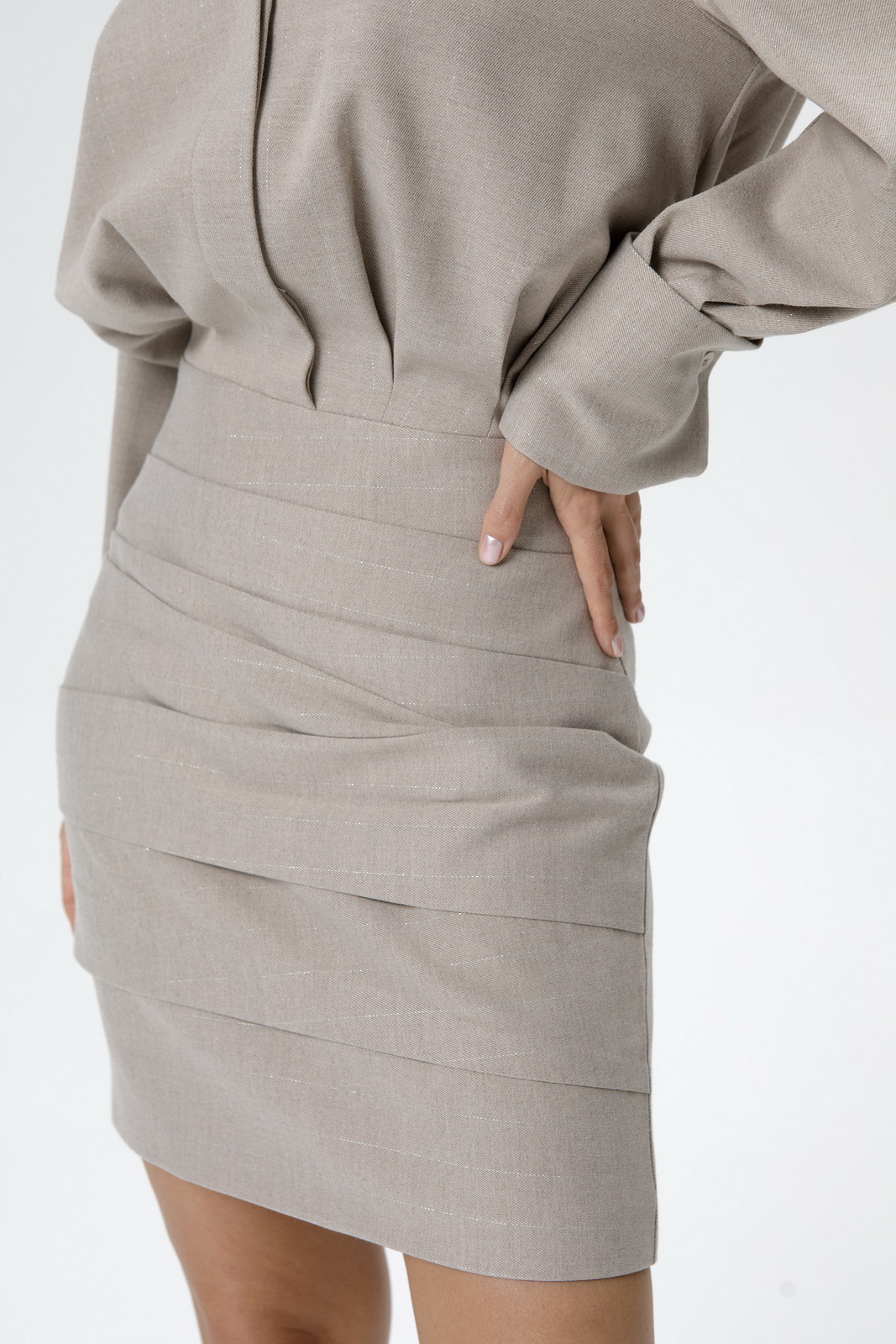 Детали: платье полуприлегающего силуэта, отрезное по талии с напуском, нижняя часть переда с ассиметричными складками, нижняя часть спинки с талиевыми вытачками, верхняя часть платья со складками на талии, рубашечный воротник, застёжка на потайную планку с пуговицами, потайная молния в боковом шве, рубашечный покрой рукава с расширенным плечом, широкие манжеты. Юбка платья на подкладке