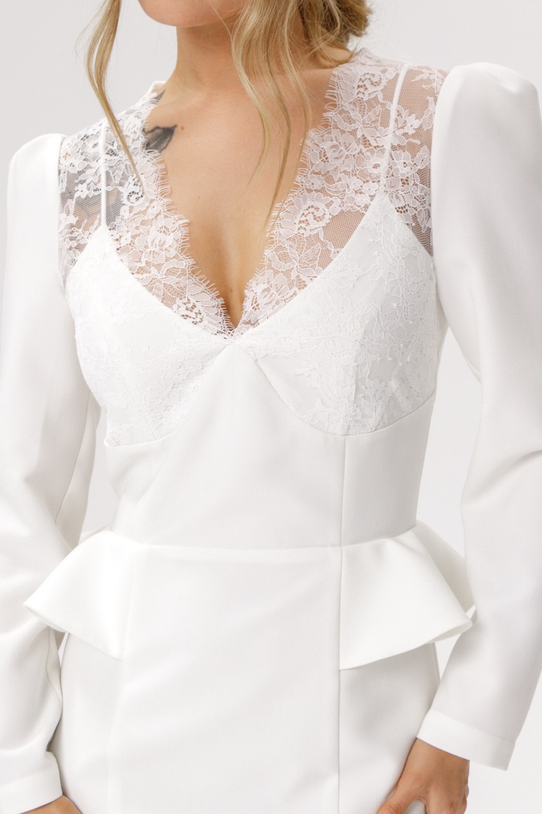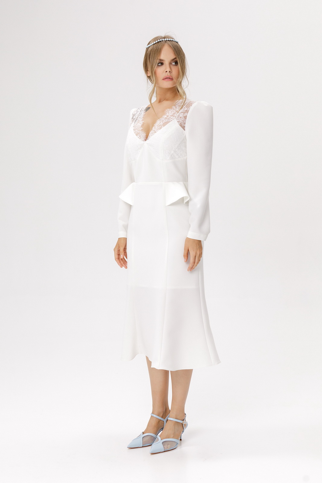 Описание: Приталенное платье с кружевным лифом и отлетными деталями по талии.