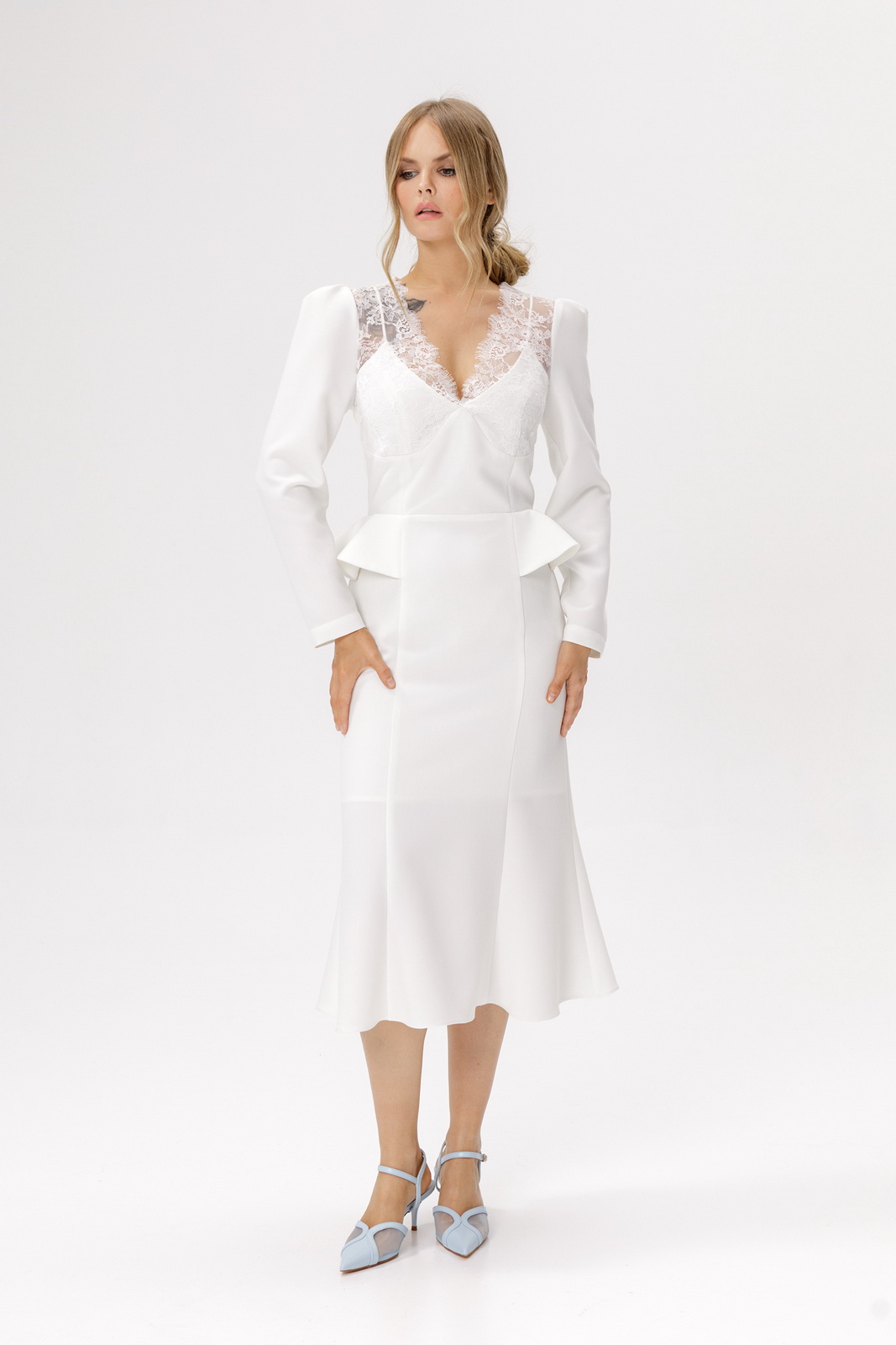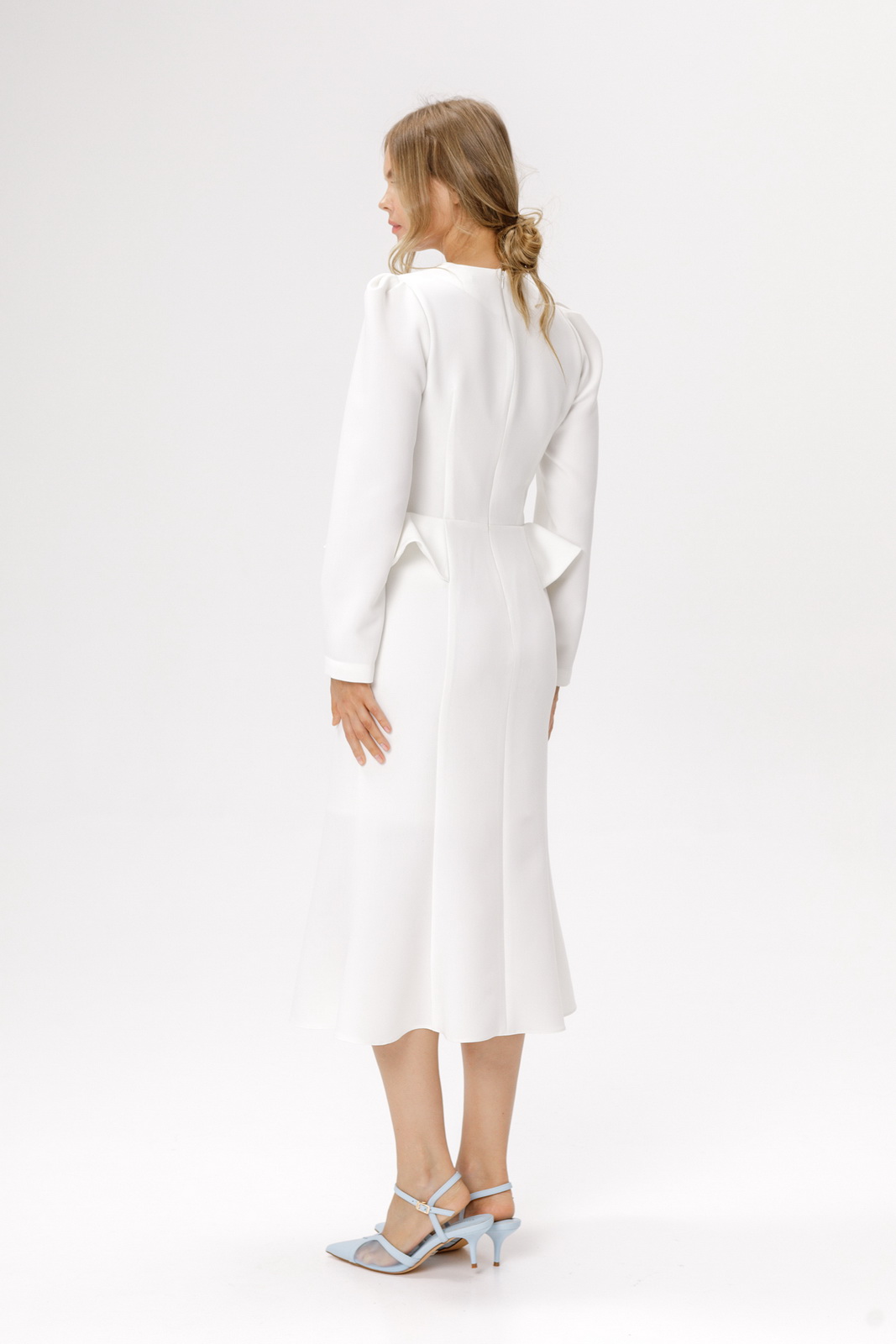 Детали: прилегающий силуэт, фигурный лиф переда, отрезная линия талии, рельефные швы по юбке платья, потайная застежка по спинке, втачные длинные рукава со сборкой по окату, на подкладке.