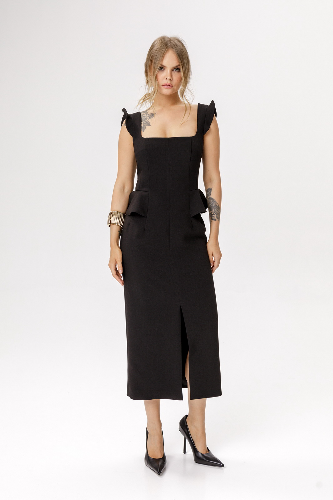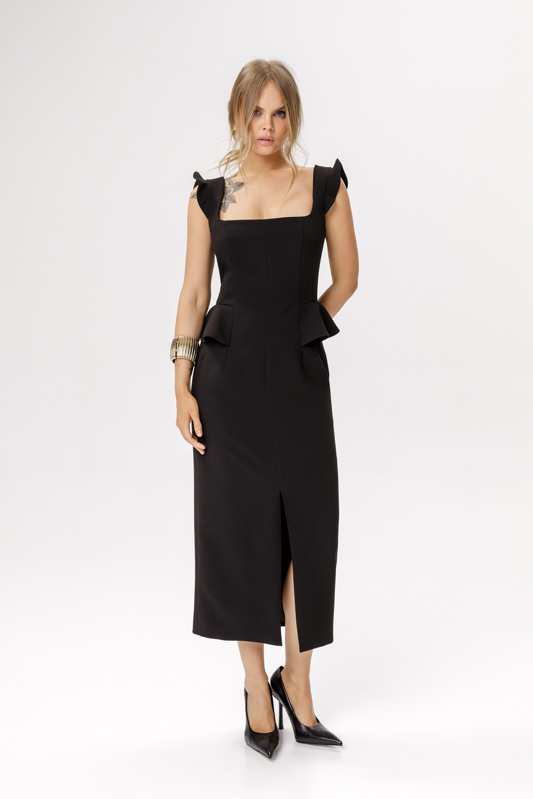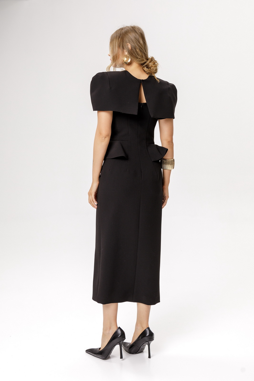 Описание: Приталенное миди-платье с глубоким вырезом и отлетными деталями по талии(приобрести кейп с фото можно по арт. 6640).