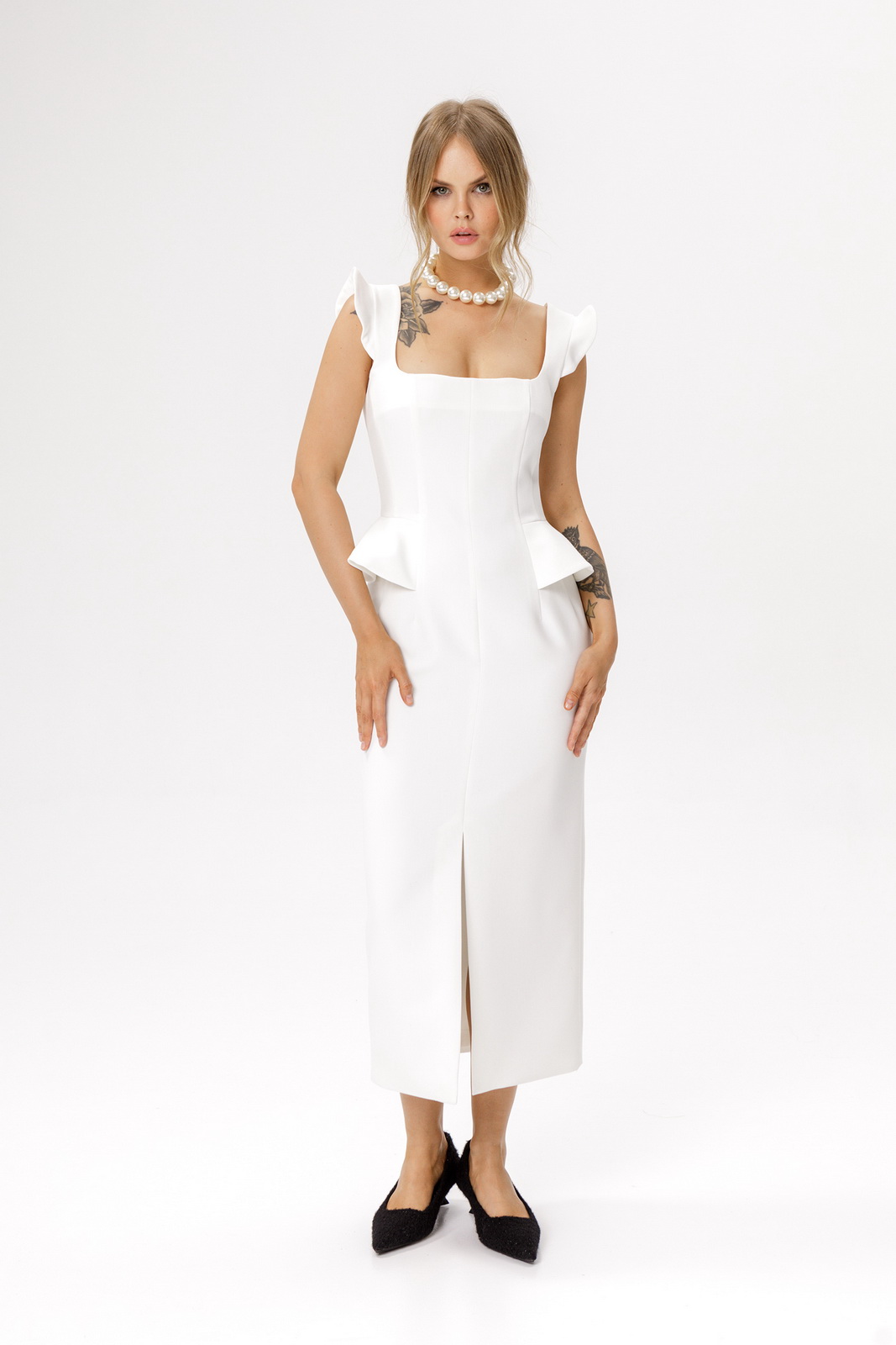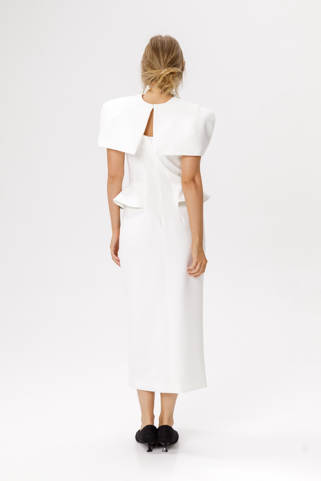 Описание: Приталенное миди-платье с глубоким вырезом и отлетными деталями по талии(приобрести кейп с фото можно по арт. 6640).