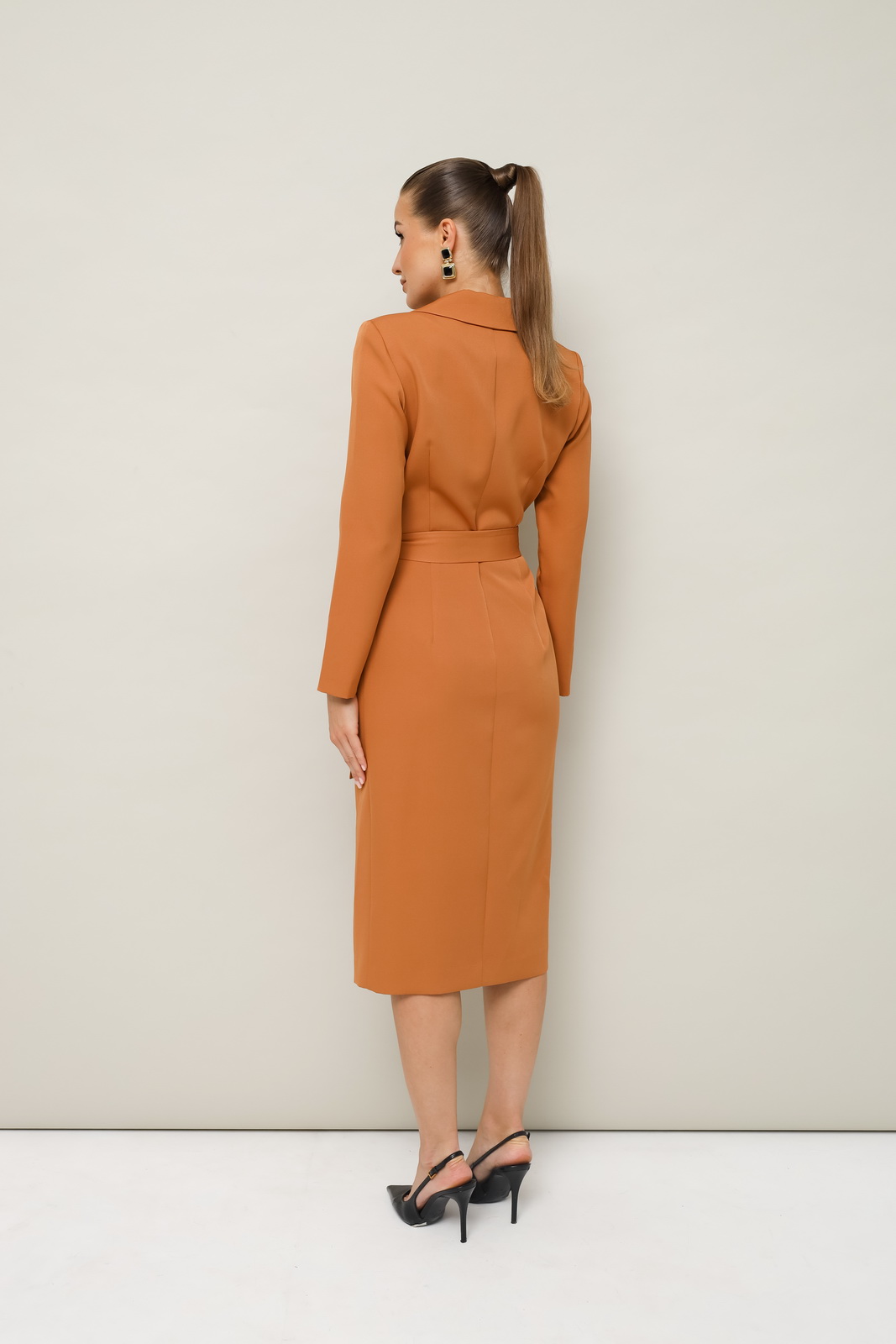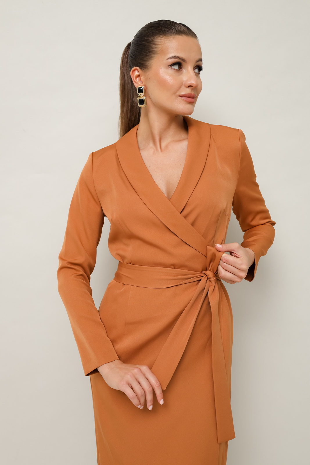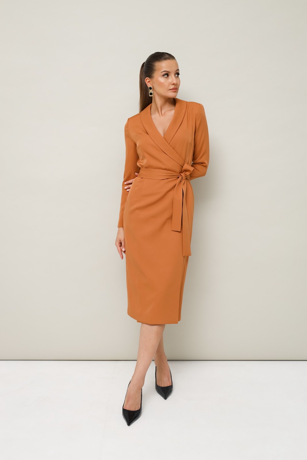 Описание: Платье-футляр полуприлегающего силуэта в длине миди, выполнено из костюмно-плательной ткани. Воротник шалевого типа. Застёжка на запах с потайной кнопкой. Рукава длинные втачные. По спинке средний шов. В комплекте прилагается пояс из основной ткани.