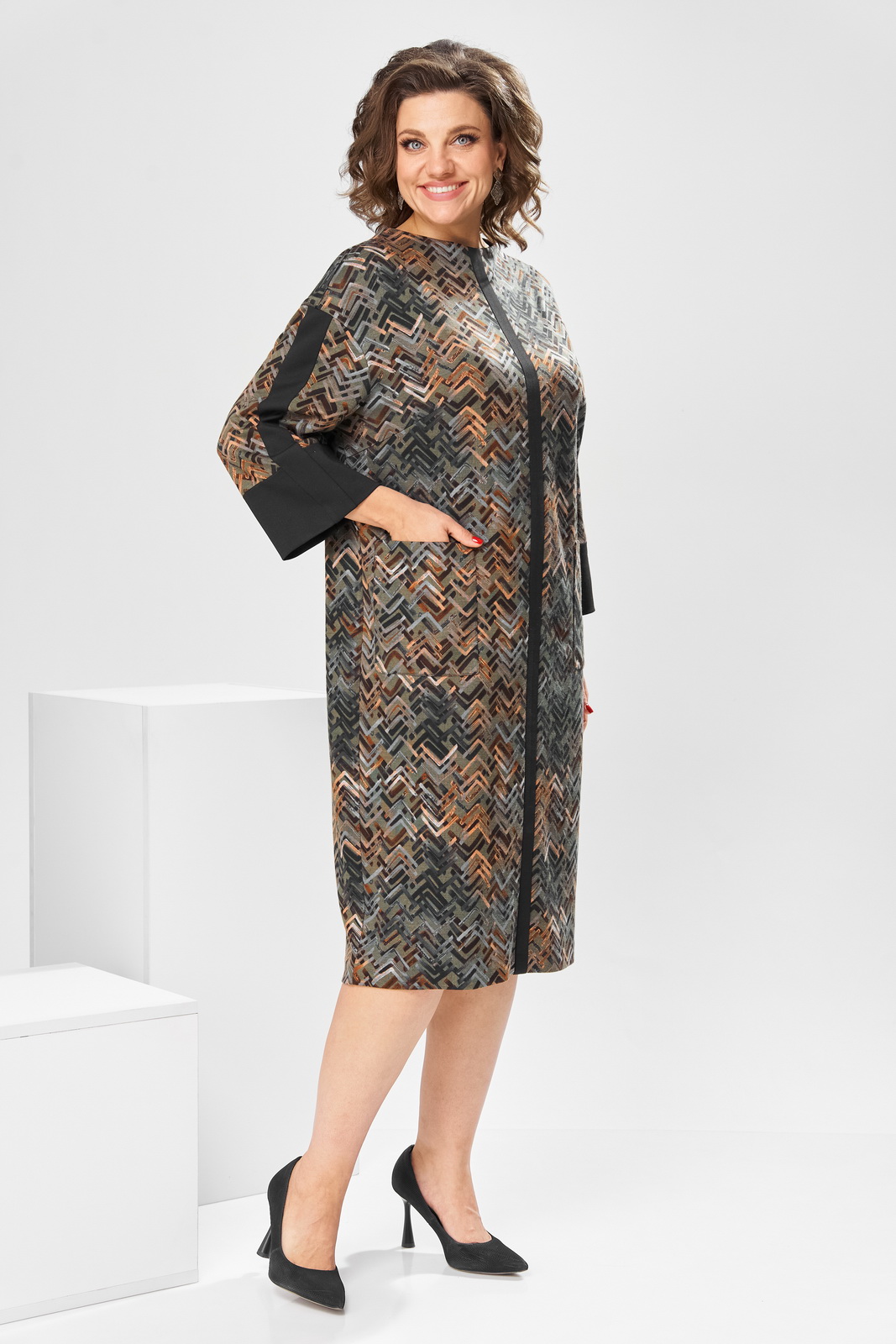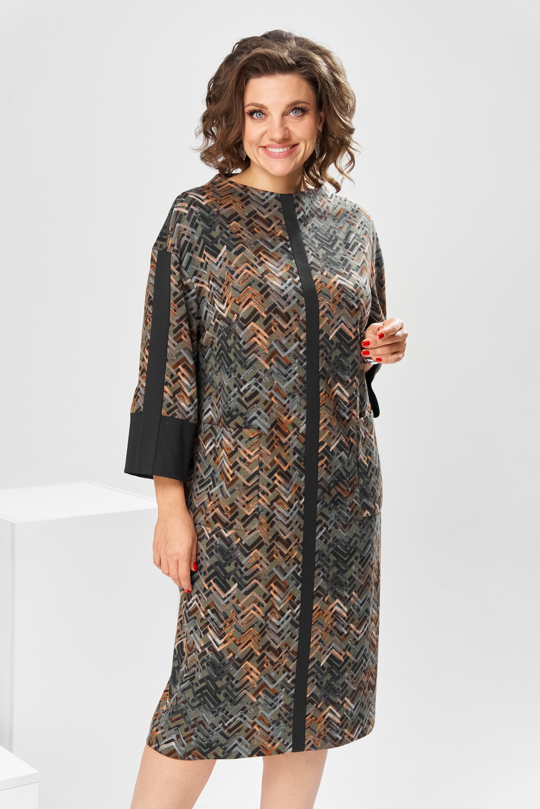 Описание: Платье женское для повседневной носки. Платье женское полу прилегающего силуэта, длиной за колено. Перед с 2-мянагрудными выточками, с 2-мя накладными прямоугольными карманами, на уровне линии бёдер, с приточной вертикальной планкой из отделочной ткани. Спинка со средним швом, заканчивающимся разрезом. Застёжка на потайную тесьму-молнию в среднем шве спинки. Горловина с цельнокроеной стойкой, обточная. Платье со спущенным плечом. Рукав втачной, длиной 7/8 с приточной манжетой из отделочной ткани и приточной вертикальной планкой из отделочной ткани по центру. Платье без плечевых накладок. Длина спинки 107 см, длина рукава от горловины 61 см.