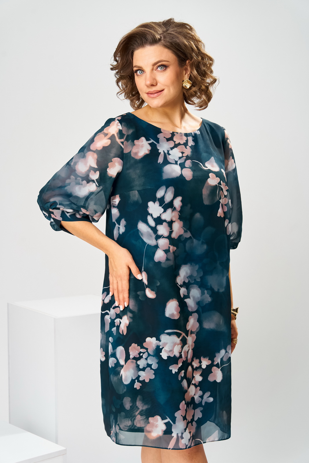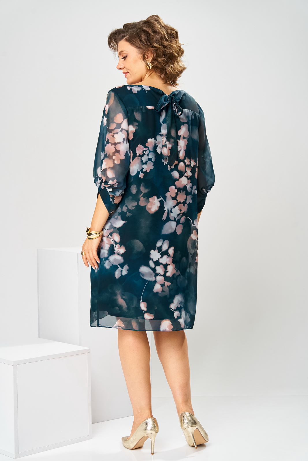 Описание: Платье женское относится к нарядной торжественной одежде. Платье женское прямого силуэта, длиной за колено. Перед с 2-мя нагрудными вытачками. Спинка с отрезной кокеткой с фигурным обтачным разрезом, фиксирующимся по горловине на 2-е обточные завязки. Горловина круглая, обтачная, без воротника. Рукав втачной, одношовный, длиной 3/4 с фигурным низом с 14-ю односторонними складками (по 7 с каждой стороны от угла манжеты), с притачной манжетой из отделочной ткани. Платье на подкладке. Платье без плечевых накладок.