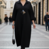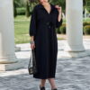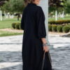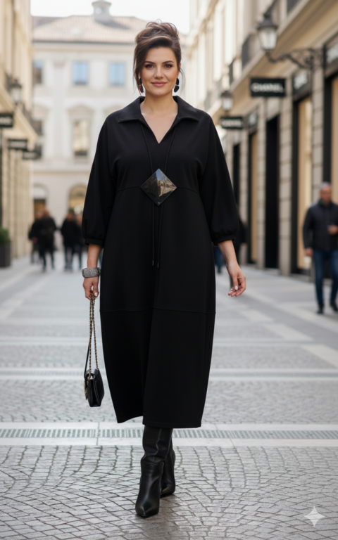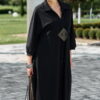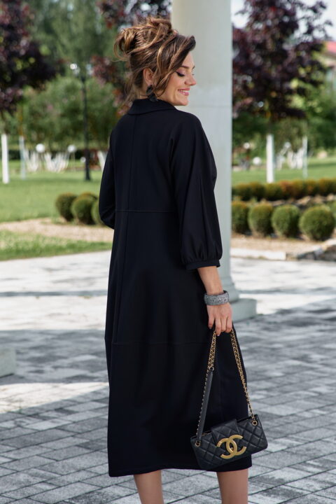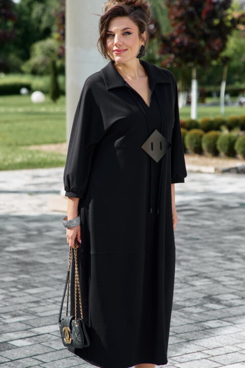 Описание: Представляем вашему вниманию элегантное платье миди в насыщенном чёрном оттенке, который актуален в любом сезоне. Выполненное из мягкой, струящейся ткани, оно обеспечивает приятные ощущения при носке и безупречную посадку. Свободный крой платья напоминающий собой форму «купола» слегка заужается к низу придает силуэту изящество и позволяет ему деликатно ниспадать по фигуре. V-образный вырез горловины, дополненный отложным воротником, придает платью классический и в то же время современный вид. Линия талии завышенная, лиф платья двойной, со средним швом. Рукав в платье цельнокроеный со сборкой на манжету, добавляют образу непринужденности и объема. Горизонтальный шов, расположенный примерно на уровне бедер, создает интересный структурный акцент. В боковых швах карманы. В качестве дополнительного декоративного элемента в комплекте с платьем идёт украшение ручной работы. Длина платья 125 см., длина рукава 62,5 см (р 52-56), 64,5 см (р 58-62).