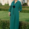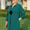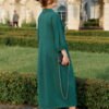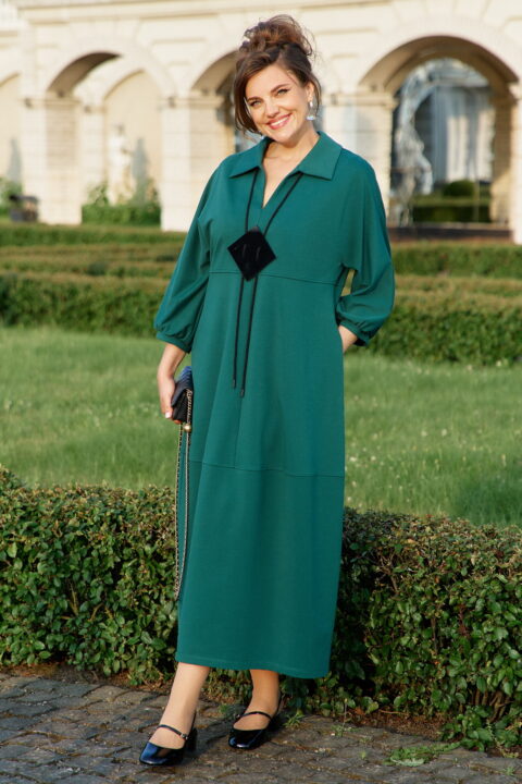 Описание: Представляем вашему вниманию элегантное платье миди в насыщенном чёрном оттенке, который актуален в любом сезоне. Выполненное из мягкой, струящейся ткани, оно обеспечивает приятные ощущения при носке и безупречную посадку. Свободный крой платья напоминающий собой форму «купола» слегка заужается к низу придает силуэту изящество и позволяет ему деликатно ниспадать по фигуре. V-образный вырез горловины, дополненный отложным воротником, придает платью классический и в то же время современный вид. Линия талии завышенная, лиф платья двойной, со средним швом. Рукав в платье цельнокроеный со сборкой на манжету, добавляют образу непринужденности и объема. Горизонтальный шов, расположенный примерно на уровне бедер, создает интересный структурный акцент. В боковых швах карманы. В качестве дополнительного декоративного элемента в комплекте с платьем идёт украшение ручной работы. Длина платья 125 см., длина рукава 62,5 см (р 52-56), 64,5 см (р 58-62).
