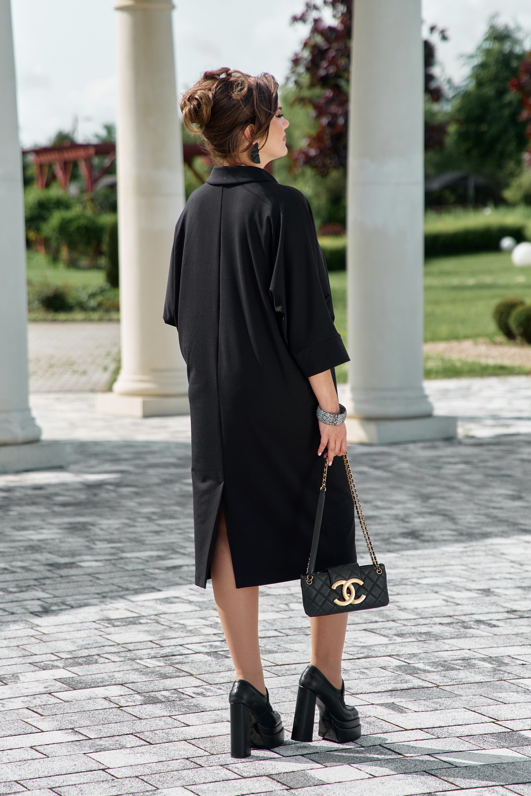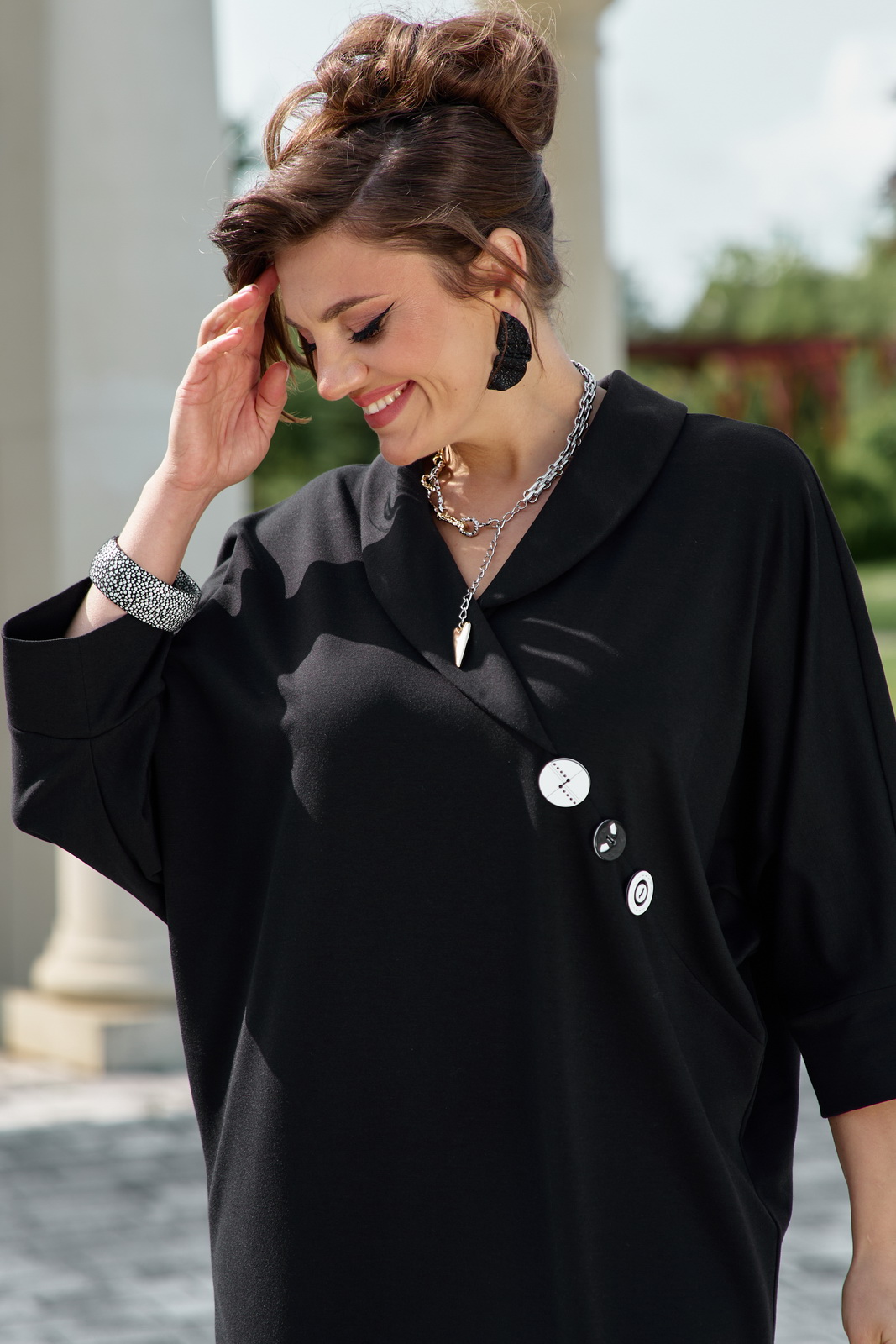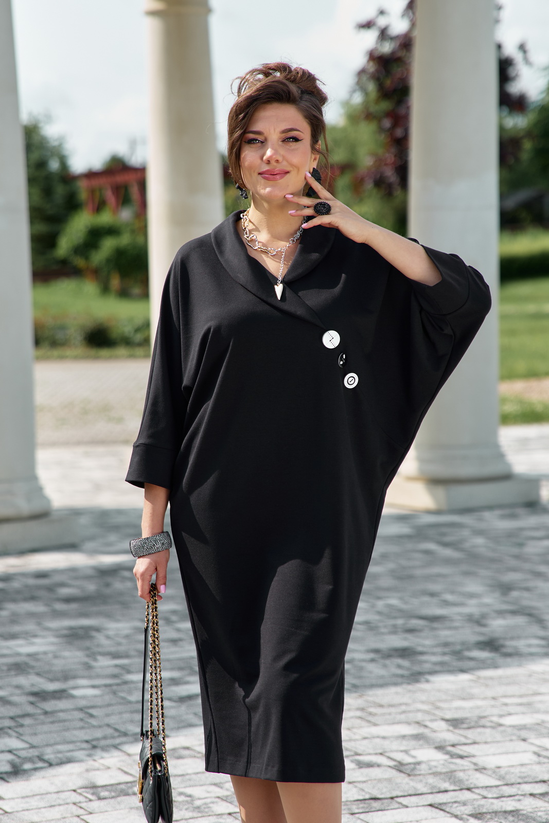 Описание: Интересный крой платья и пластические свойства трикотажного полотна помогут скрыть недостатки фигуры и создать идеальный образ. Платье свободного силуэта, заужается к низу. Горловина в платье открытая, с ассиметричным отложным воротником переходящим в подрез по переду платья. Спинка со средним швом. Рукав в платье по форме «летучая мышь» с притачной манжетой по низу.В качестве главного акцента платья, который приковывает взгляды, являются пришивные декоративные пуговицы контрастного цвета и разных размеров.Обращаем Ваше внимание, что фурнитура может незначительно отличаться от фото. Длина платья 112,5 см. Длина рукава 58 см (р.52-56), 60 (р.58-62).
