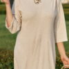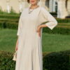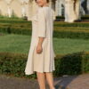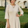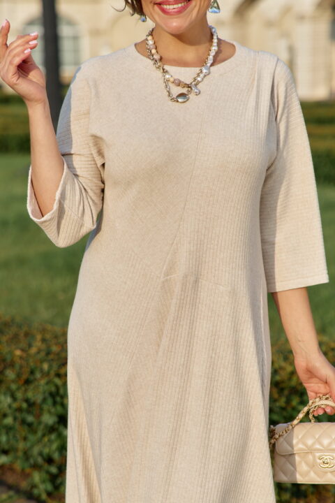 Описание: Платье выполнено из высококачественного трикотажа в рубчик, известного как “лапша”, это платье обеспечивает приятные тактильные ощущения и отличную посадку по фигуре. Силуэт “клеш” от талии деликатно ниспадает, создавая летящую, женственную форму, которая подчеркивает достоинства фигуры и дарит свободу движений. Горловина округлой формы, оформлена бейкой. По переду платья фигурные подрезы, позволяющие полоске в платье ложиться в разных направлениях создавая интересный образ; у плеча декоративная заложенная складка. Рукав в платье цельнокроеный. Длина миди и рукава три четверти придают платью утонченный и завершенный вид. Длина платья 119 см, длина рукава 52 см.