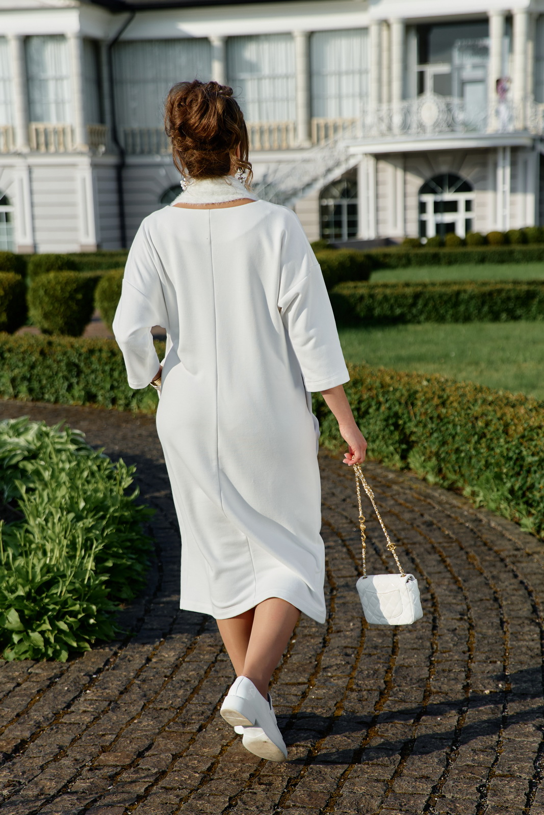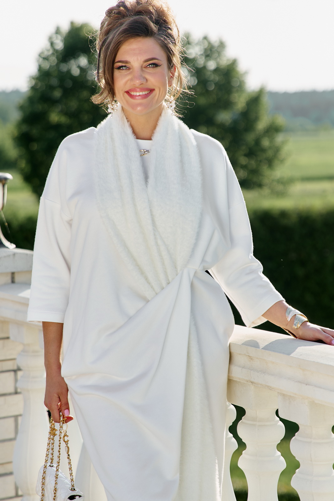 Описание: Если Вы ищете идеальное сочетание стиля и комфорта, вот идеальный выбор. Мы специально подобрали качественную и тактильно приятную ткань, которая хорошо держит свою форму, создавая ощущение легкости и свободы движения. Платье свободного силуэта, слегка заужается к низу, с округлой формой горловины, линия плеча спущенная. Главная интрига кроется в декоративной складке в подрезе по переду. Это тщательно продуманный декоративный элемент. Эта складка — свидетельство высокого искусства кройки; она добавляет глубину и динамику лаконичному фасону, создавая иллюзию движения даже в неподвижности. Спинка в платье со средним швом. Рукав в платье втачной, длиной 7/8. Но кульминацией образа становится отдельный декоративный элемент. Шарф, идущий в комплекте, драпируется на шее, являясь частью наряда. Он создаёт завершающий образ.Вместе с платьем они создают диалог текстуры и формы, тем самым завершая образ. Гладкое, платье служит идеальным холстом для струящейся драпировки шарфа. Длина платья 116 см (р.52-56), 117 см (р.58-62), длина рукава 31 см (р.52-56), 30 см (р.58-62).
