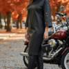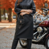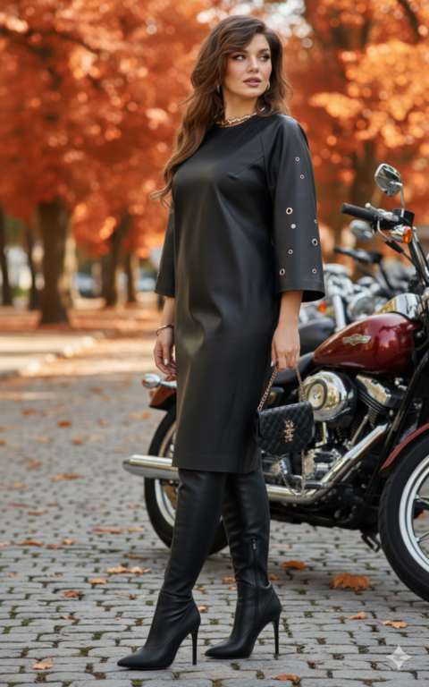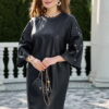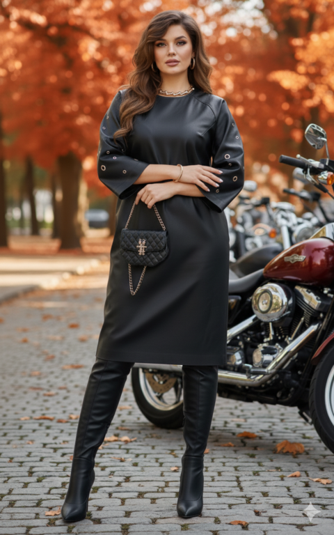 Описание: Платье полуприлегающего силуэта с округлой формой горловины. По переду платья нагрудные вытачки. По спинке застёжка на декоративную тесьму молнию в среднем шве платья и разрезом от низа. Рукава становятся главным акцентом: ряд люверсов и кнопок, выстроенных словно доспехи, придают образу дерзкий, почти урбанистический шик. Рукав в платье реглан, расширяется к низу, длиной 7/8. В боковых швах платье карманы. Длина платья 109 см (р 50-54), 111 см (р 56-60). Длина рукава 61 см.