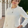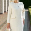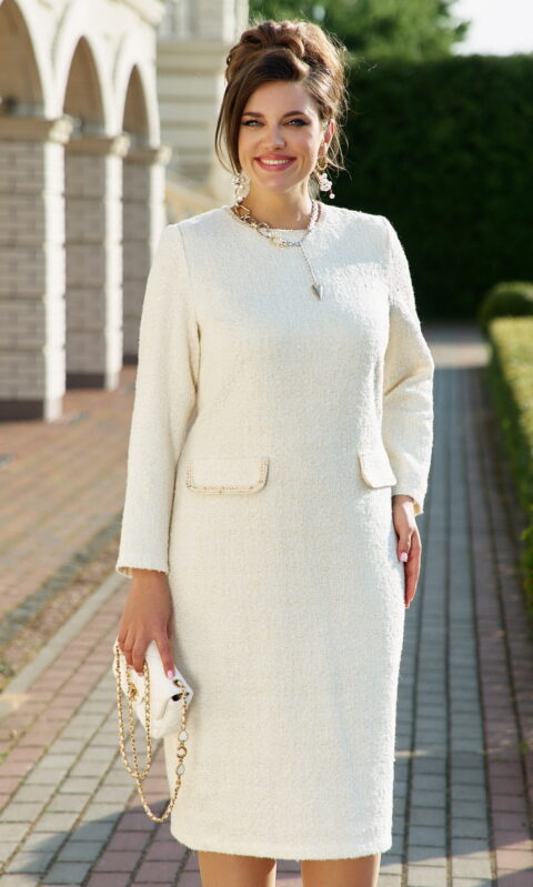 Описание: Безумно красивое и элегантное платье в модном оттенке «сливочного масла» мягко обволакивает фигуру, создавая тем самым шикарный образ. Его стиль, утончённость делает женщину поистине роскошной. Платье идеально подойдёт как для повседневной носки, так и для торжественных выходов, подчеркивает достоинства фигуры и успешно скрывает все недостатки. Платье прилегающего силуэта с округлой горловиной с отделкой в виде декоративной отделочной тесьмы. По переду платья нагрудные вытачки, отделочные клапана карманов с декоративной отделкой в виде тесьмы. По спинке застёжка на декоративную тесьму-молнию. Рукав в платье втачной, длинный. Платье на подкладке. Длина платья 111 см (р 48-52), 111,5 см (р 54-58), длина рукава 61 см.