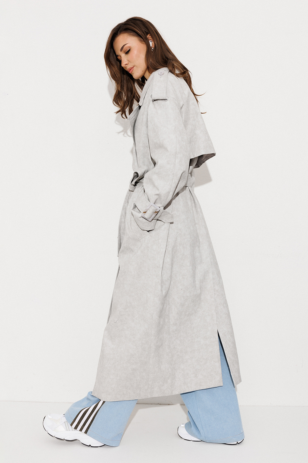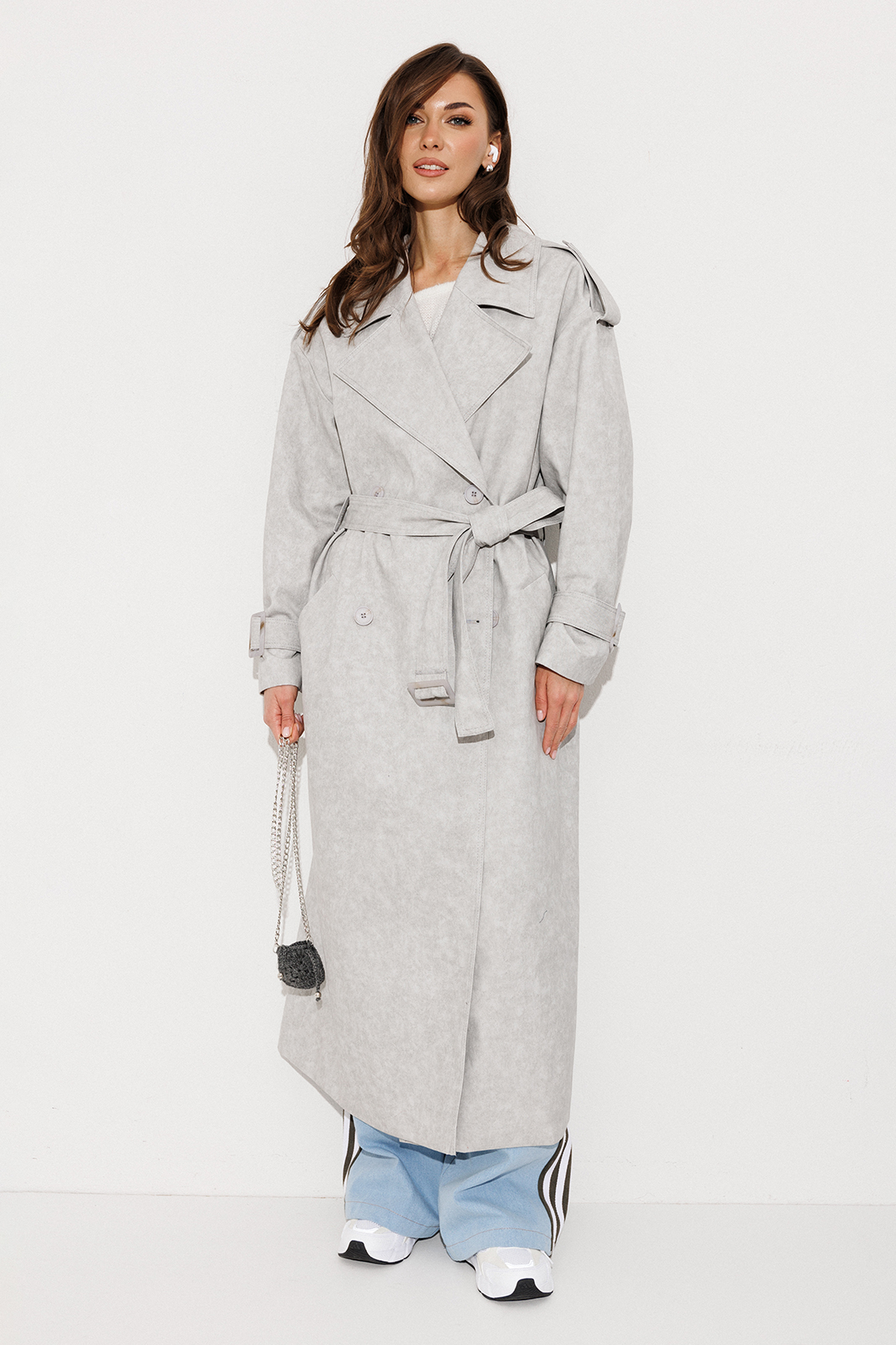 Описание: Плащ-тренчкот длинный прямого силуэта с двубортной застежкой на петли-пуговицы, втачным двух шовным рукавом и спущенной линией плеча, по низу рукавов паты с пряжкой. Воротник пиджачного типа – отложной с лацканом. Полочка с карманом-листочкой. Спинка со средним швом заканчивающимся шлицей и с отлетной кокеткой. По плечевому шву погон с застежкой на петлю-пуговицу. Тренчкот со съемным поясом с пряжкой. Плащ на подкладке.