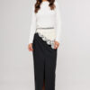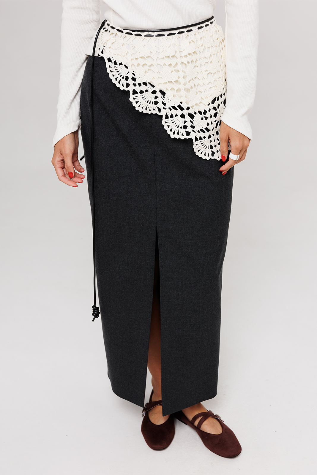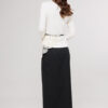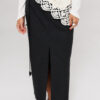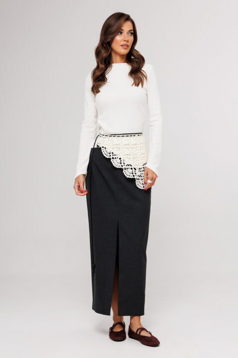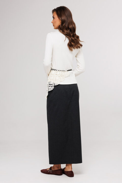 Описание: Юбка длинная прилегающего силуэта на притачном поясе. По переду вертикальные вытачки от пояса и центральным швом внизу заканчивающимся высоким разрезом. Спинка с 2-мя вертикальными вытачками от пояса, центральным швом и застежкой на потайную тесьму-молнию в центральном шве. Юбка на подкладке.