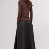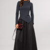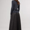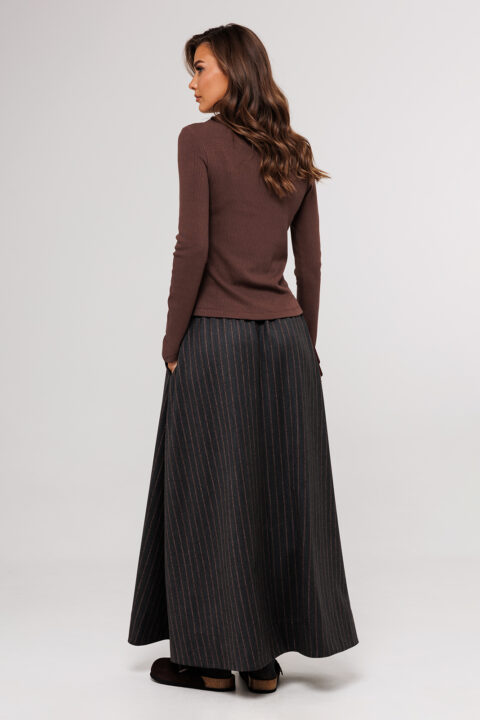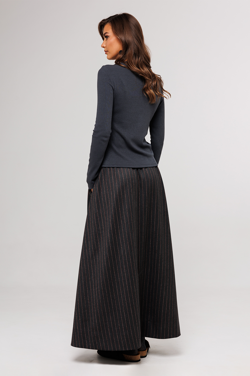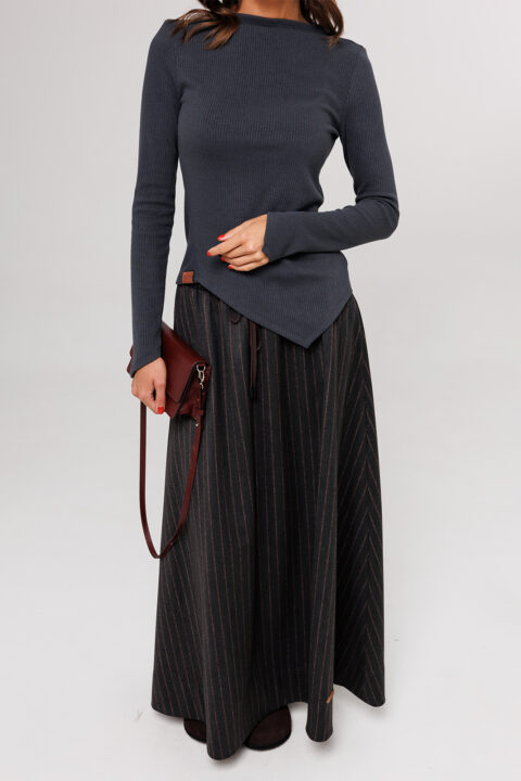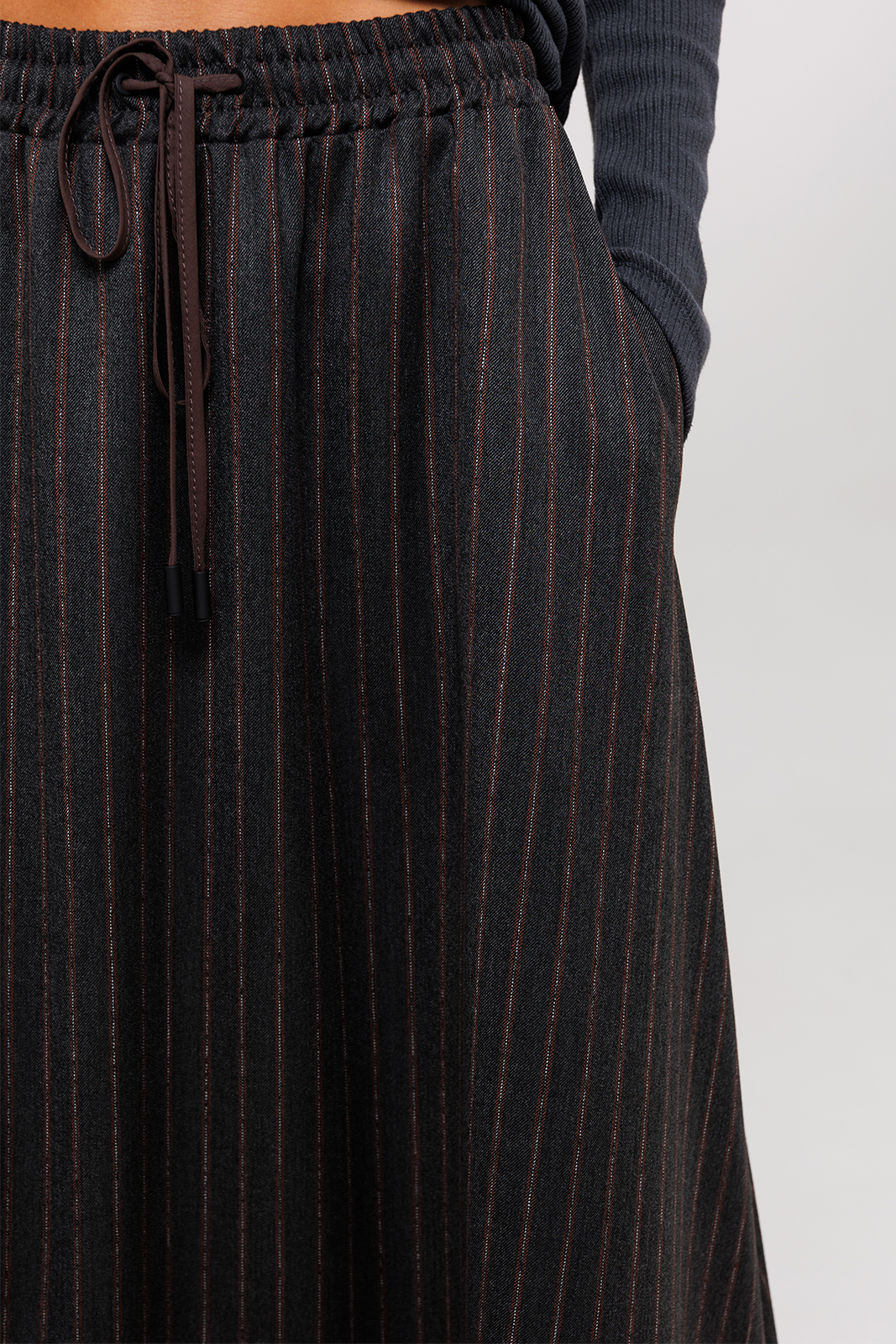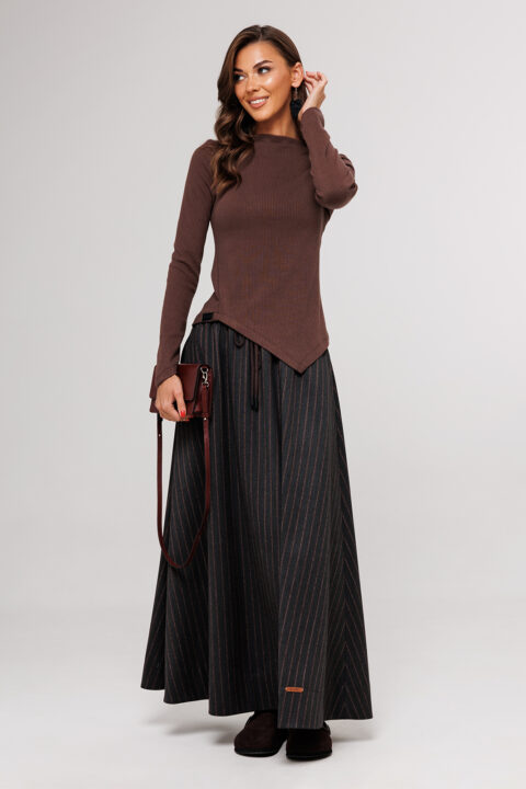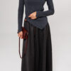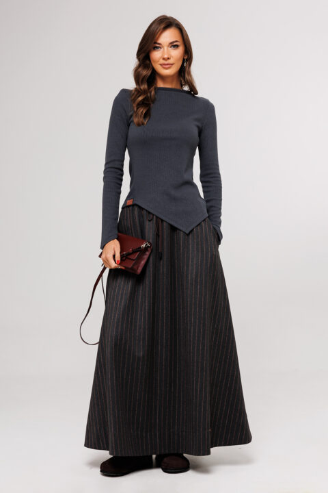 Описание: Юбка длинная из костюмной ткани А-силуэта на притачном отсроченном поясе на резинке со втянутым в него шнурком с наконечниками и карманами в боковых швах. По переду внизу нашивка “BUTER”. Юбка без подкладки