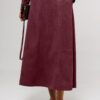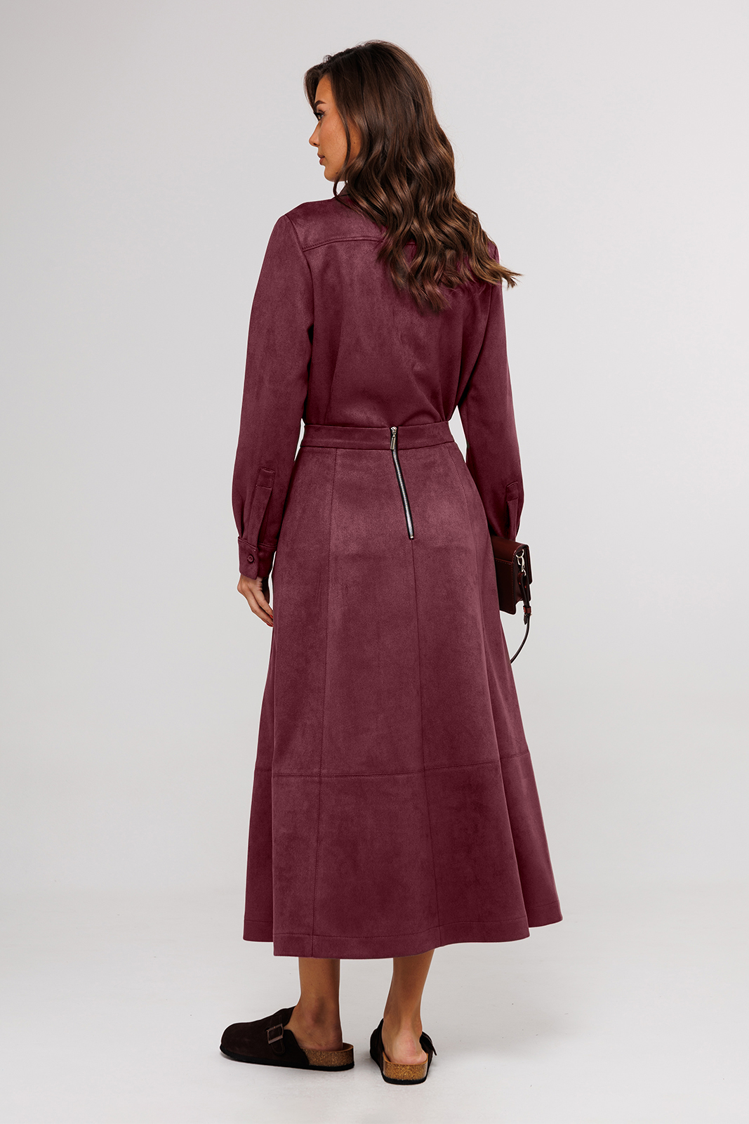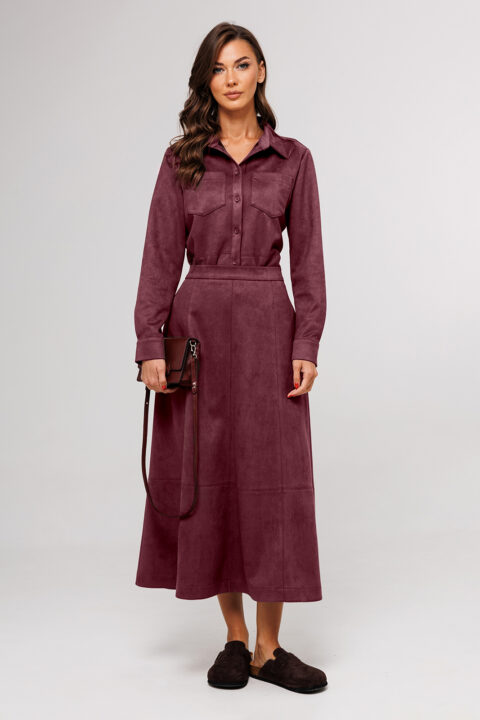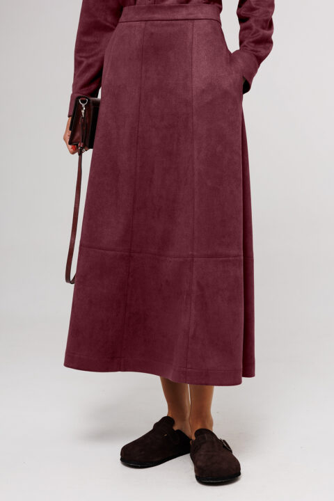 Описание: Юбка замшевая длинная А-силуэта на притачном поясе и карманами в боковых швах. Полочка и спинка с центральным швом, рельефами и горизонтальным подрезом. По спинке вверху в центральный шов вставлена металлическая молния. Юбка без подкладки.