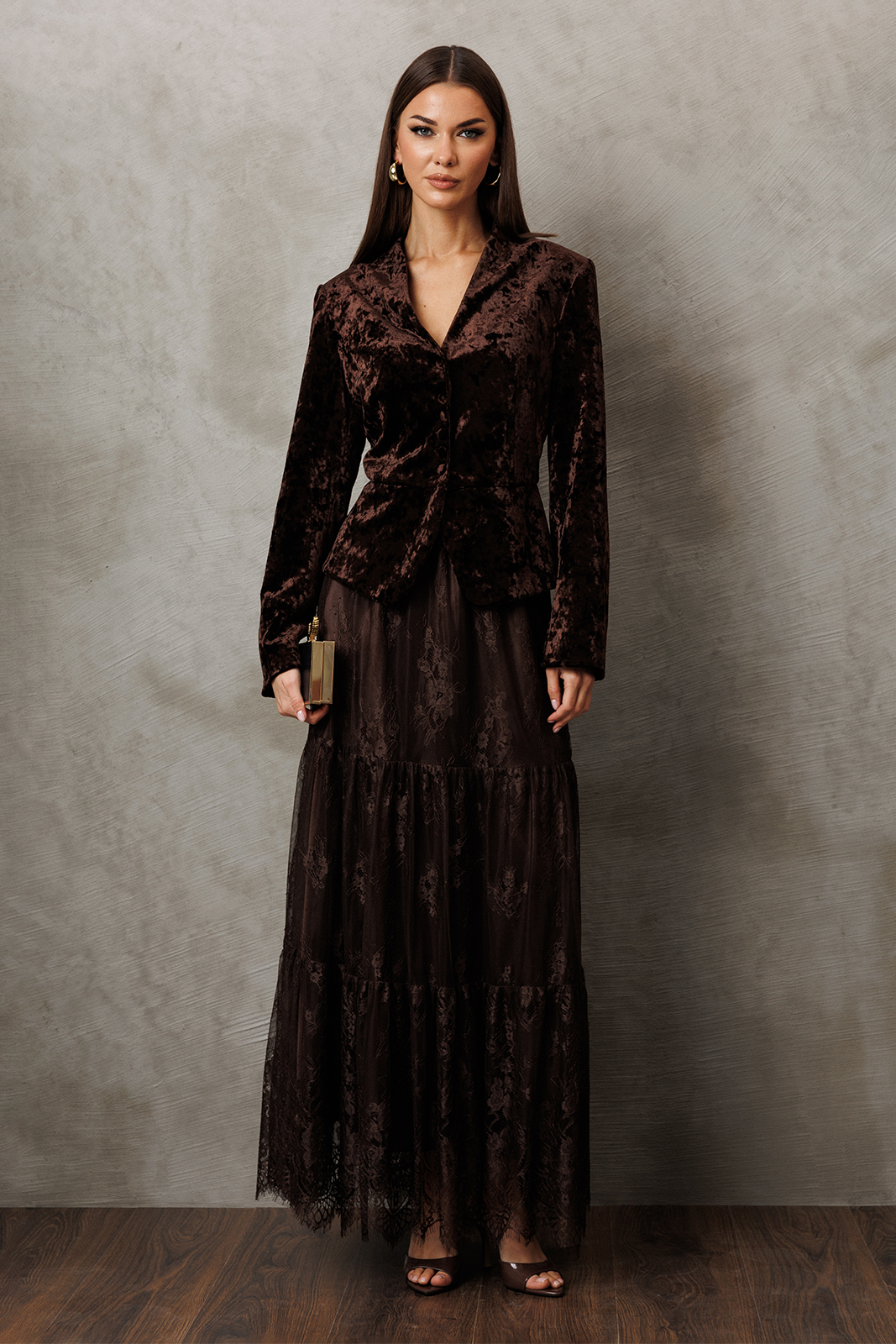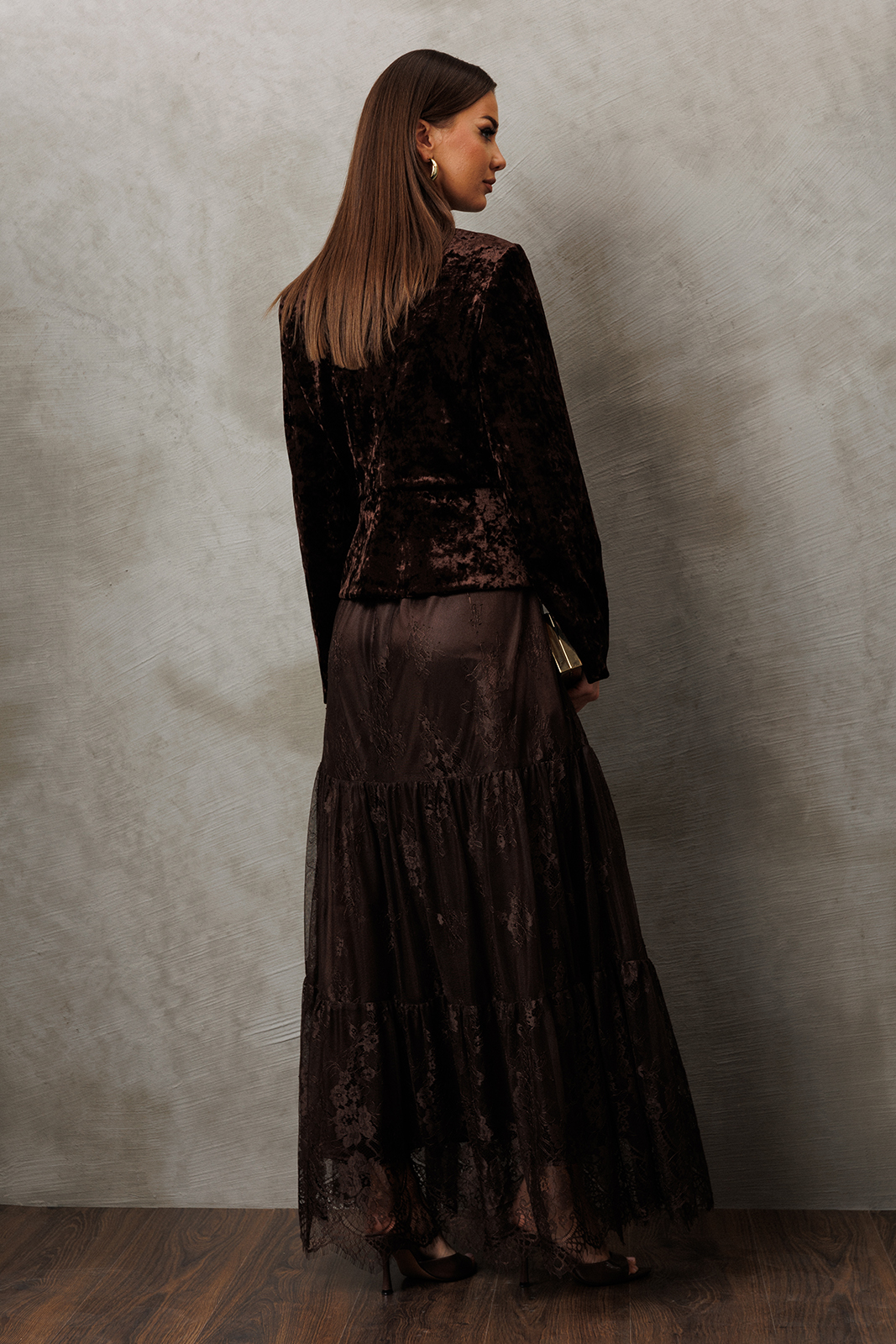 Описание: Юбка из кружева длинная на притачном поясе из кружева со вставленной в него резинкой. Юбка с 2-мя притачными слегка присборенными воланами. Юбка на подкладке.