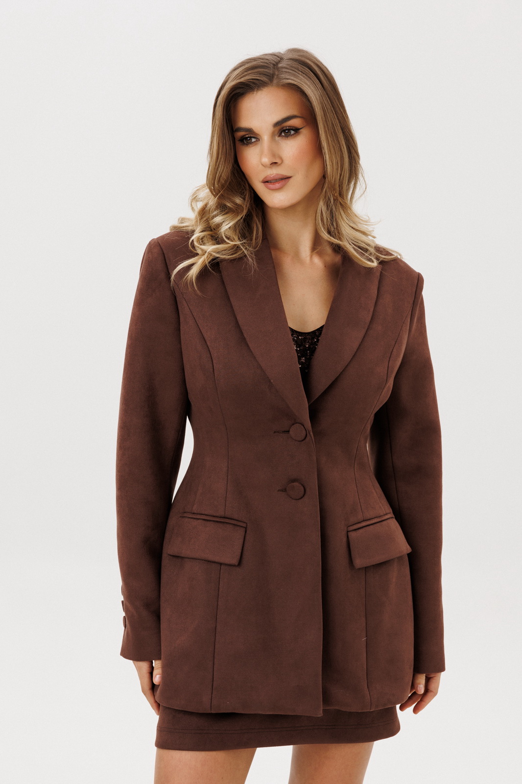 Описание: Юбка выполнена из плотной искуственной замши. Юбка прямого силуэта, длиной выше линии колена. Переднее полотнище цельное. Сзади в среднем шве застежка на потайную молнию.