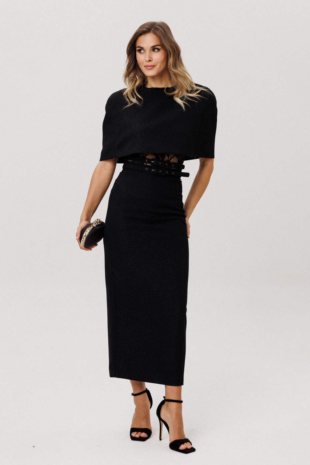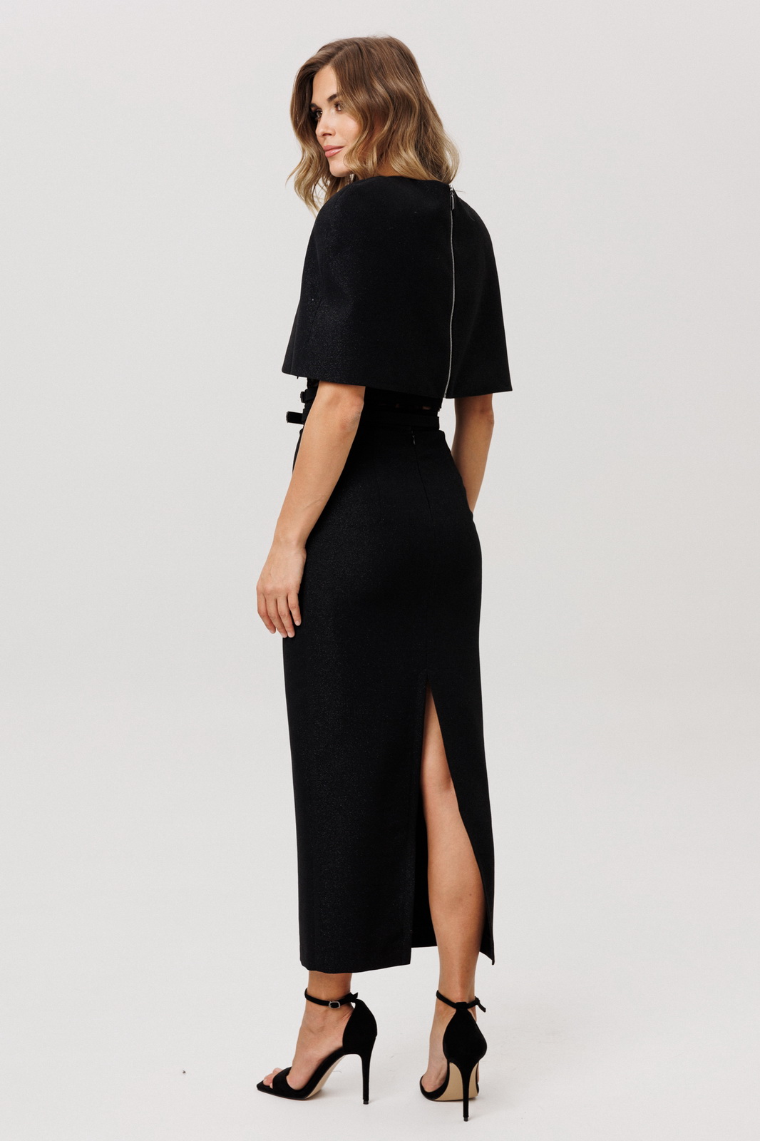 Описание: Юбка выполнена из костюмно-плательной ткани с блеском. Юбка прямого силуэта, зауженная к низу, длиной миди. Юбка на поясе, застегивающимя на петлю и пуговицу и на потайную молнию сзади в среднем шве. Юбка на отлетной по низу подкладке. В комплект входит два съемных ремня из основной ткани с обтяжной пряжкой и блочками.