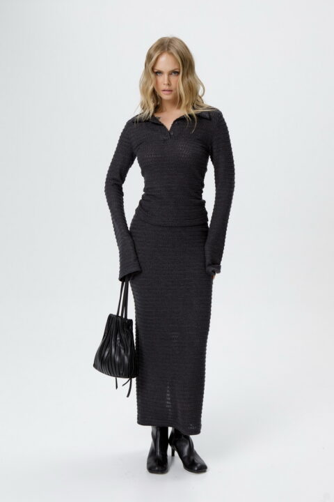 Детали: прямой силуэт, пояс на резинке, высокий разрез. Юбка на трикотажной подкладке.