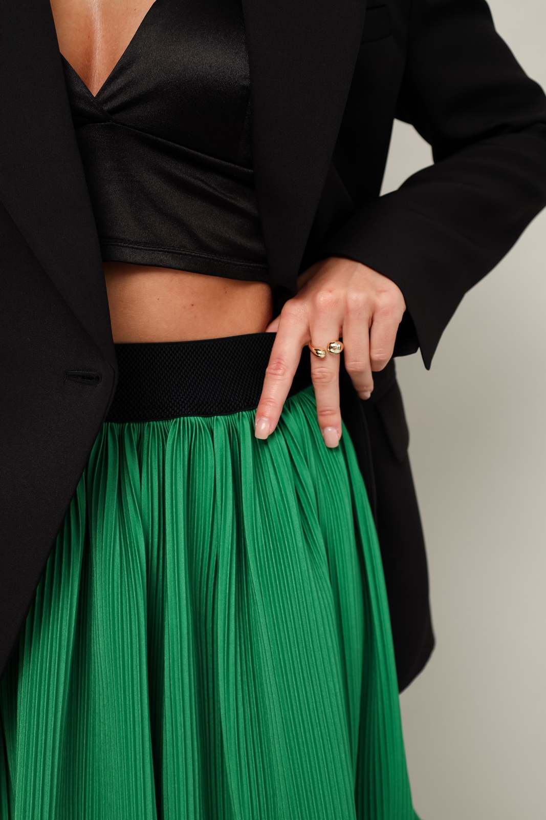 Описание: Юбка в длине мини, выполнена из ткани с мелкой плиссировкой. Притачной пояс на резинке. Низ юбки обработан с использованием лески для создания эффектного края.