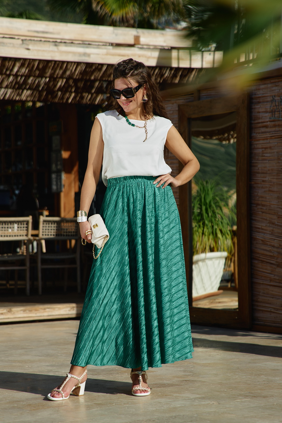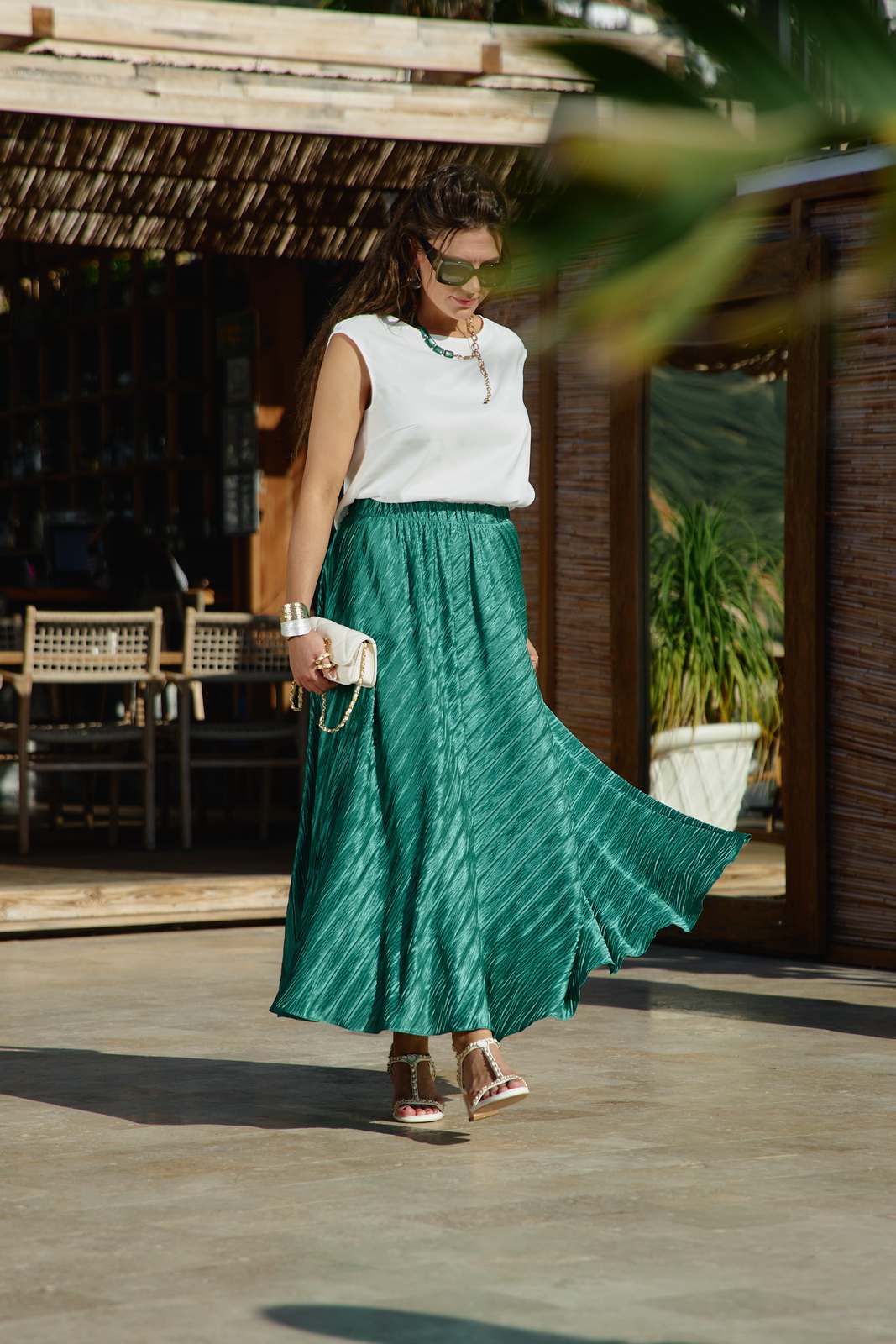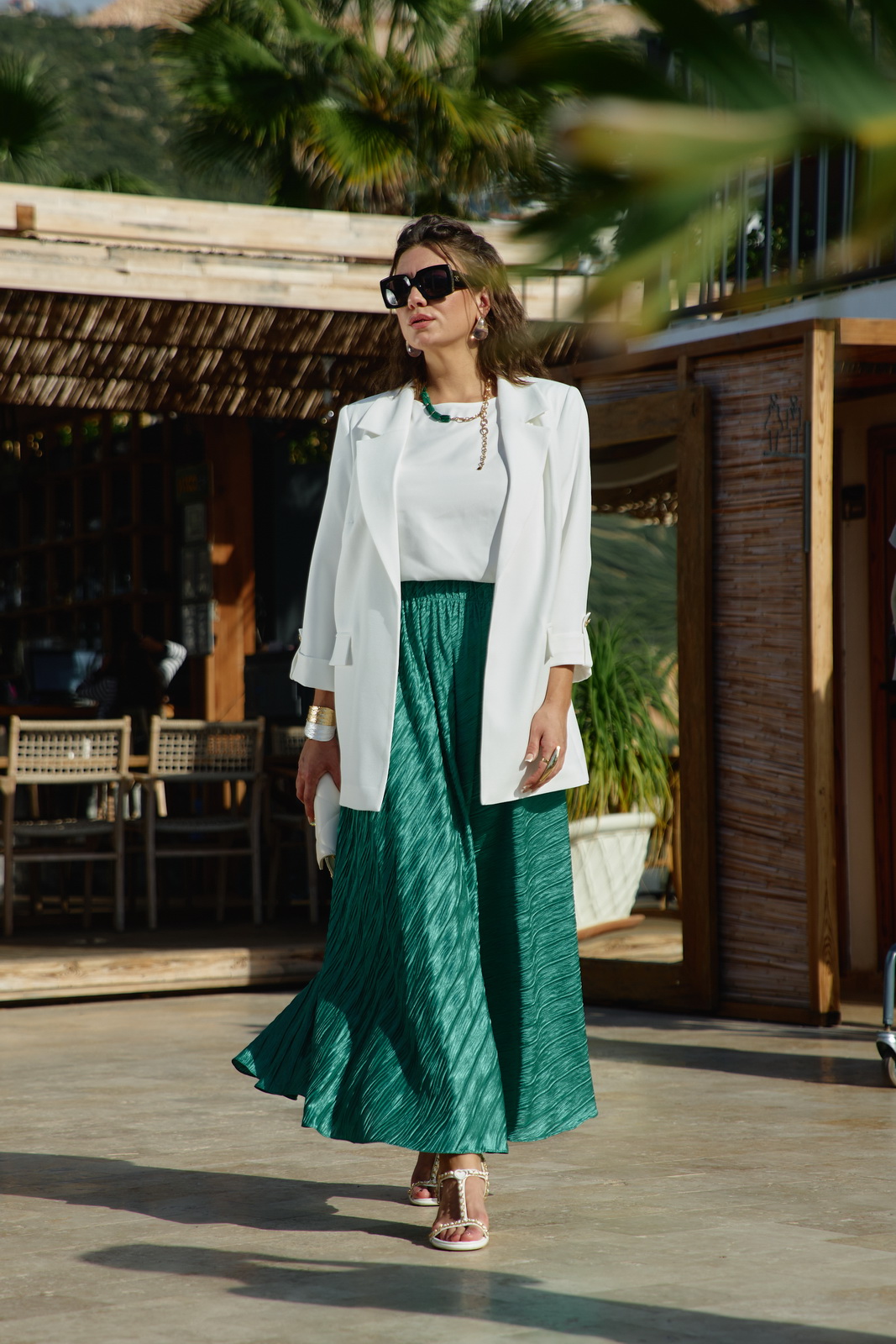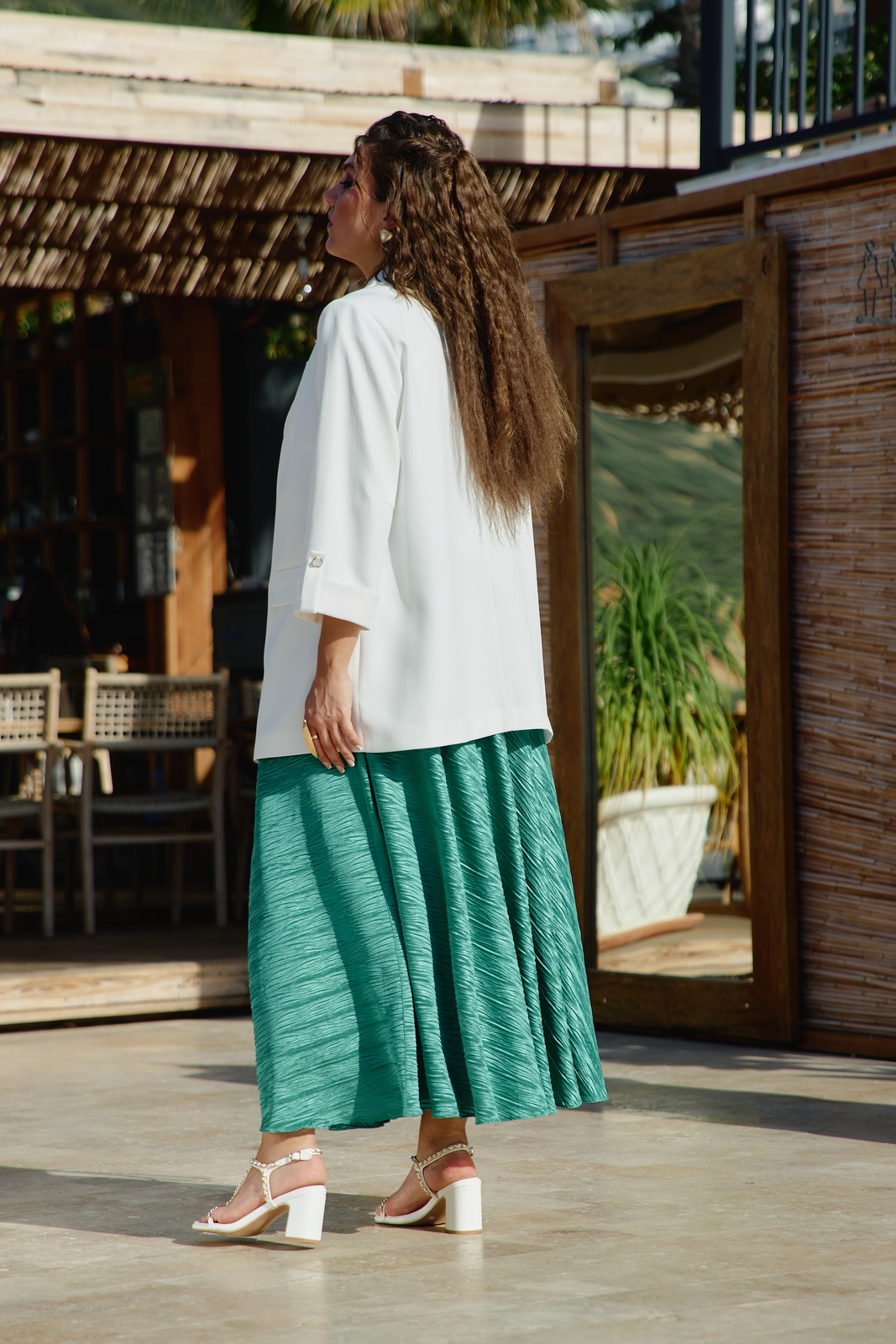 Описание: Юбка «полусолнце» в длине миди с жатой фактурой — это сочетание лёгкой драматичности и непринуждённой элегантности. Её силуэт создаёт мягкую визуальную волну, а жатая поверхность превращает каждый изгиб в игру света и тени: она одновременно утончённая и характерная, романтичная и по-городски современная. Из-за сжатой фактуры ткани юбка выглядит живой и объёмной.