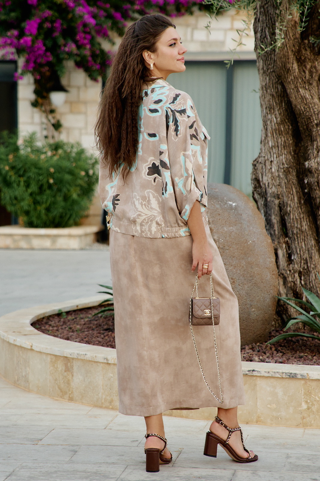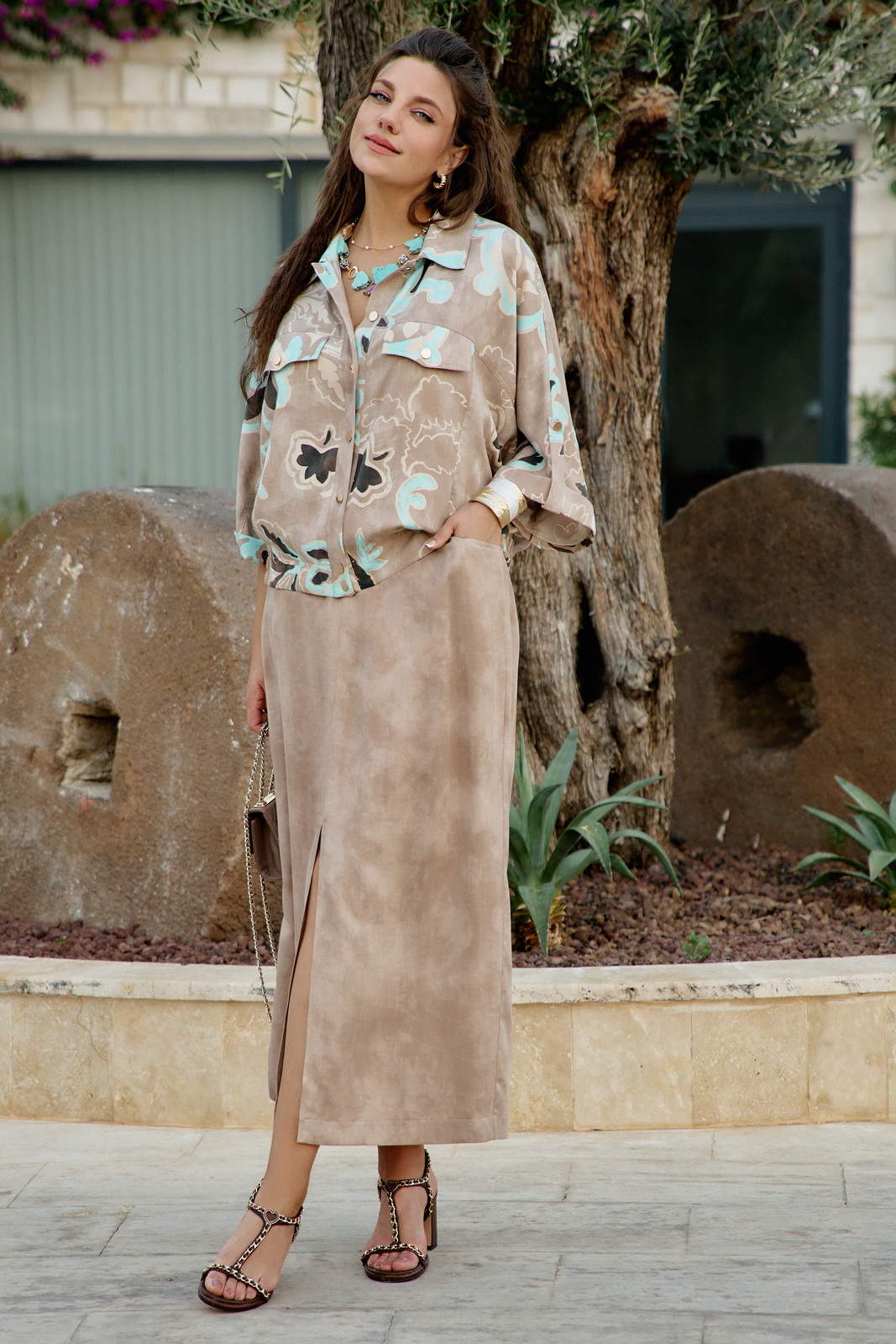 Описание: Эта юбка длины миди, выполненная из стопроцентного тенсела, воплощает в себе эстетику «жидкого золота». В глубоком бежевом оттенке материал обретает особую магию. Бархатистая текстура тенсела дарит коже исключительный комфорт, делая эту вещь воплощением современной женственности, где чувственность встречается с безупречным удобством. Юбка длины миди с разрезом в среднем шве по переду. Пояс в юбке притачной с эластичной тесьмой-резинкой, которая обеспечивает максимально удобную посадку на любой тип фигуры. По переду юбки наклонные карманы. Варианты стилизации: для утонченного монохромного образа дополните юбку трикотажным топом или кашемировым джемпером в оттенках бежевого, песочного или кремового. Такое сочетание фактур — гладкого тенсела и уютного трикотажа — создаст визуально дорогой и гармоничный ансамбль. Завершите наряд мюлями на небольшом каблуке и минималистичными золотыми украшениями, которые подчеркнут теплоту карамельного цвета. В рамках делового, но расслабленного дресс-кода юбка идеально подружится с объемной белой рубашкой мужского кроя из плотного хлопка. Расстегните верхние пуговицы, слегка закатайте рукава и заправьте рубашку внутрь, чтобы акцентировать талию. Кожаные лоферы и структурированная сумка-тоут добавят образу строгости, сохраняя при этом общую мягкость и грацию. Для создания дерзкого контраста в стиле гранж-шик сочетайте карамельное миди с графичной футболкой и кожаной косухой. Грубые ботинки на массивной подошве подчеркнут хрупкость и нежность ниспадающей ткани. Этот вариант идеален для городских прогулок, когда хочется выглядеть элегантно, но при этом чувствовать себя свободно и уверенно.