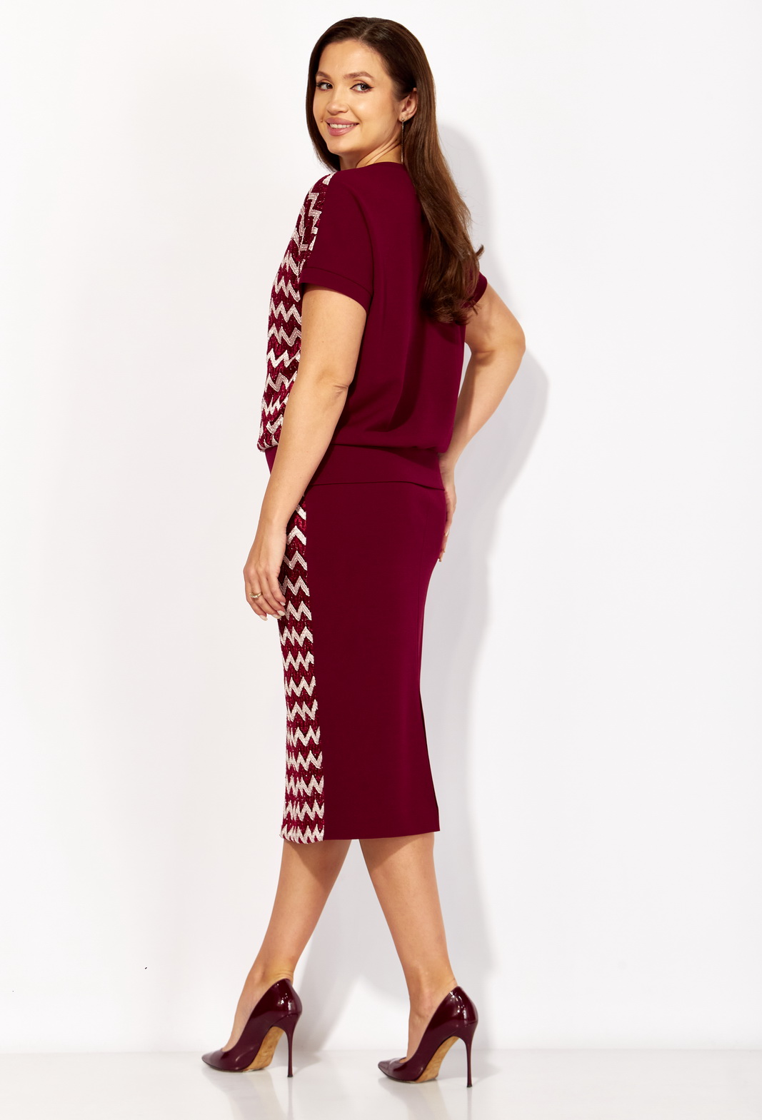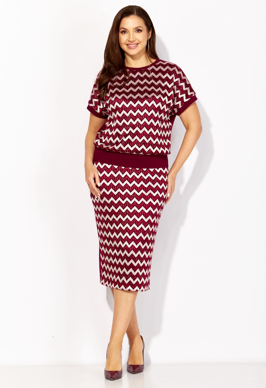 Описание: Комплект женский, 2х предметный, состоящий из блузы и юбки. Блуза прямого силуэта, с коротким цельнокроеным рукавом, снизу на манжете. Вырез горловины круглой формы. По низу рукавов и горловине подрезные бейки. Юбка прямая. Сзади средний шов и подрез снизу. Пояс на резинке(по переду отрезной, по спинке цельнокроеный) Перед блузы и юбки выполнен из полотна с паетками, спинка блузы и юбки из гладкого трикотажного полотна. По переду блузы и юбки трикотажная подкладка.