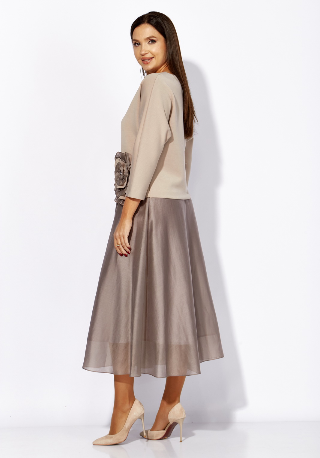 Описание: Комплект женский, 2х предметный, состоящий из блузки и юбки. Блузка полуприлегающего силуэта с цельнокройным рукавом длинной 3/4. Выполнена из трикотажного полотна “ТЕНСЕЛ”. Вырез горловины “лодочка” По низу блузки, слева, декоративный элемент изрюши, в сочетании двух видов ткани. По спинке средний шов. Юбка широкая к низу, из текстильной ткани “вуалька” На подкладке. Пояс притачной с резинкой по кругу.